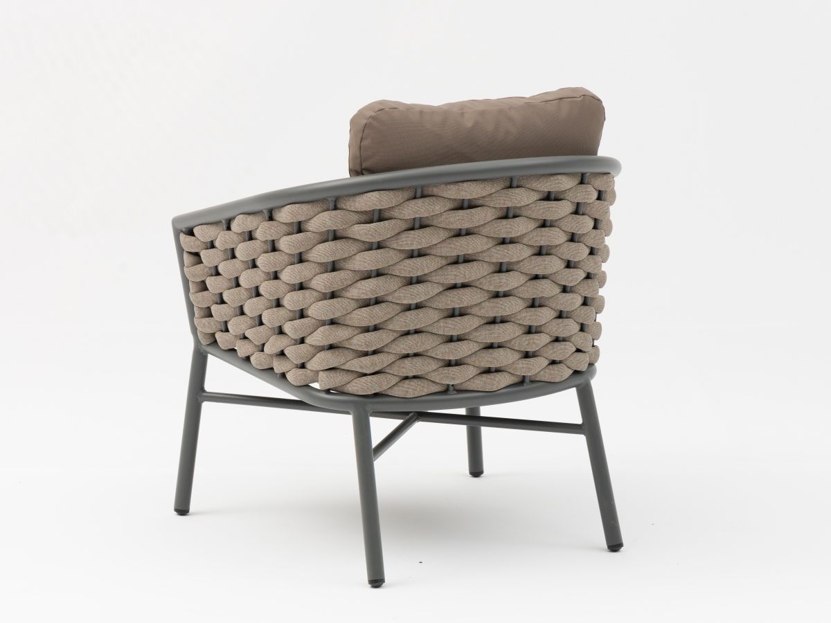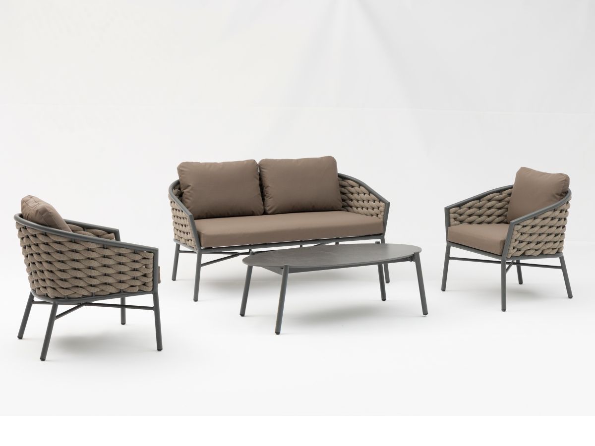 Sedacia súprava Kreta predstavuje dokonalú synergiu medzi moderným priemyselným dizajnom a organickými prvkami. Robustná antracitová konštrukcia v kombinácii s výrazným výpletom z hrubých melírovaných šnúr vytvára vizuálne pôsobivý kontrast, ktorý z tejto súpravy robí dominantný prvok každej terasy. Vďaka použitiu technológie Quick-Dry peny v polstrovaní je súprava nielen štýlová, ale aj extrémne praktická a pripravená na použitie takmer ihneď po letnej prehánke.