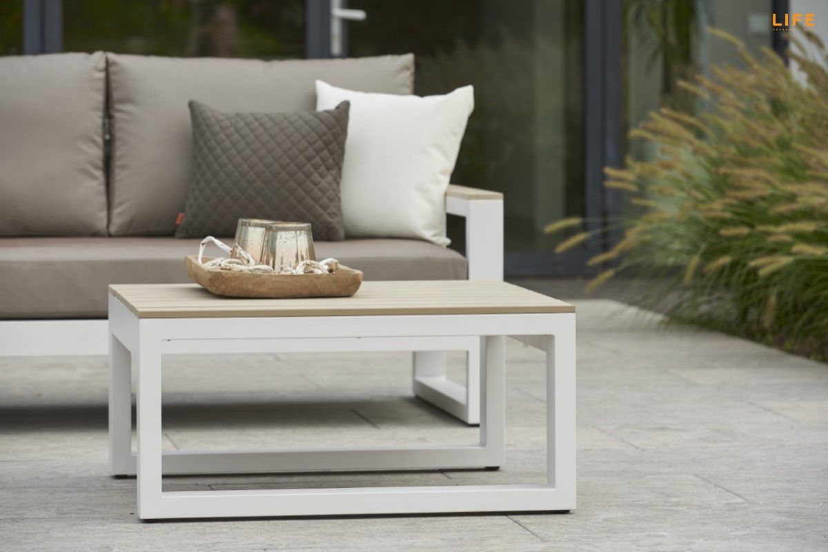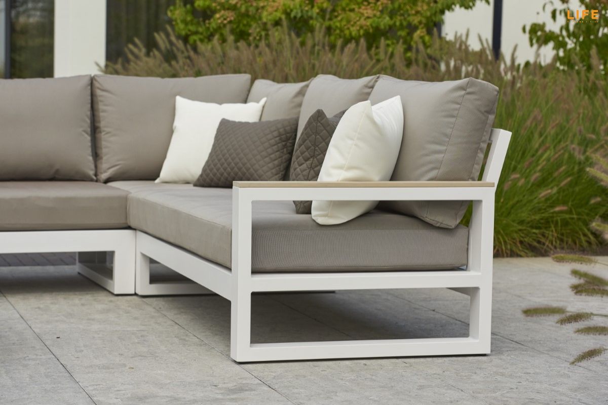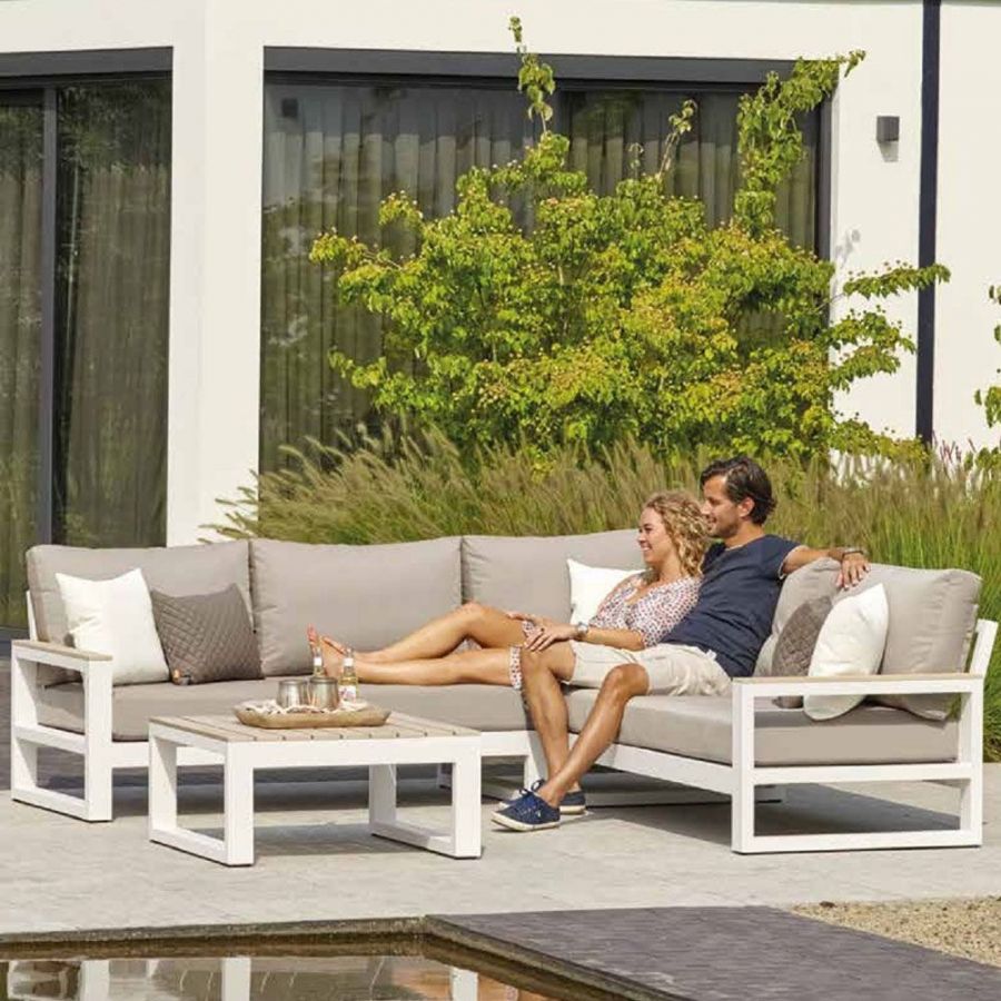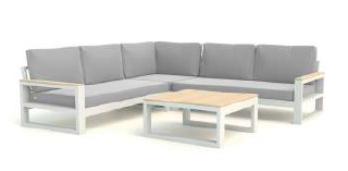 Nádherná rohová súprava Mallorca Corner white je perfektnou voľbou pre ľudí, ktorí si radi vychutnávaju svôj záhradný nábytok a trávia veľa času na terase. Sedacia súprava Mallorca je dostupná aj v lounge verzii s dvojsedačkou a dvomi kreslami. Hliníková konštrukcia sedacej súpravy je doplnená na opierkach a konferenčnom stole o polywoodové (polypropylenové) latovanie, ktoré imituje drevo. Matrace a vankúše môžu byť celoročne používané vonku vďaka All Weather Cushions. Vďaka týmto kombináciam materiálov je sedacia súprava Mallorca Corner white elegantnou voľbou ako zveľadiť Váš exteriér.