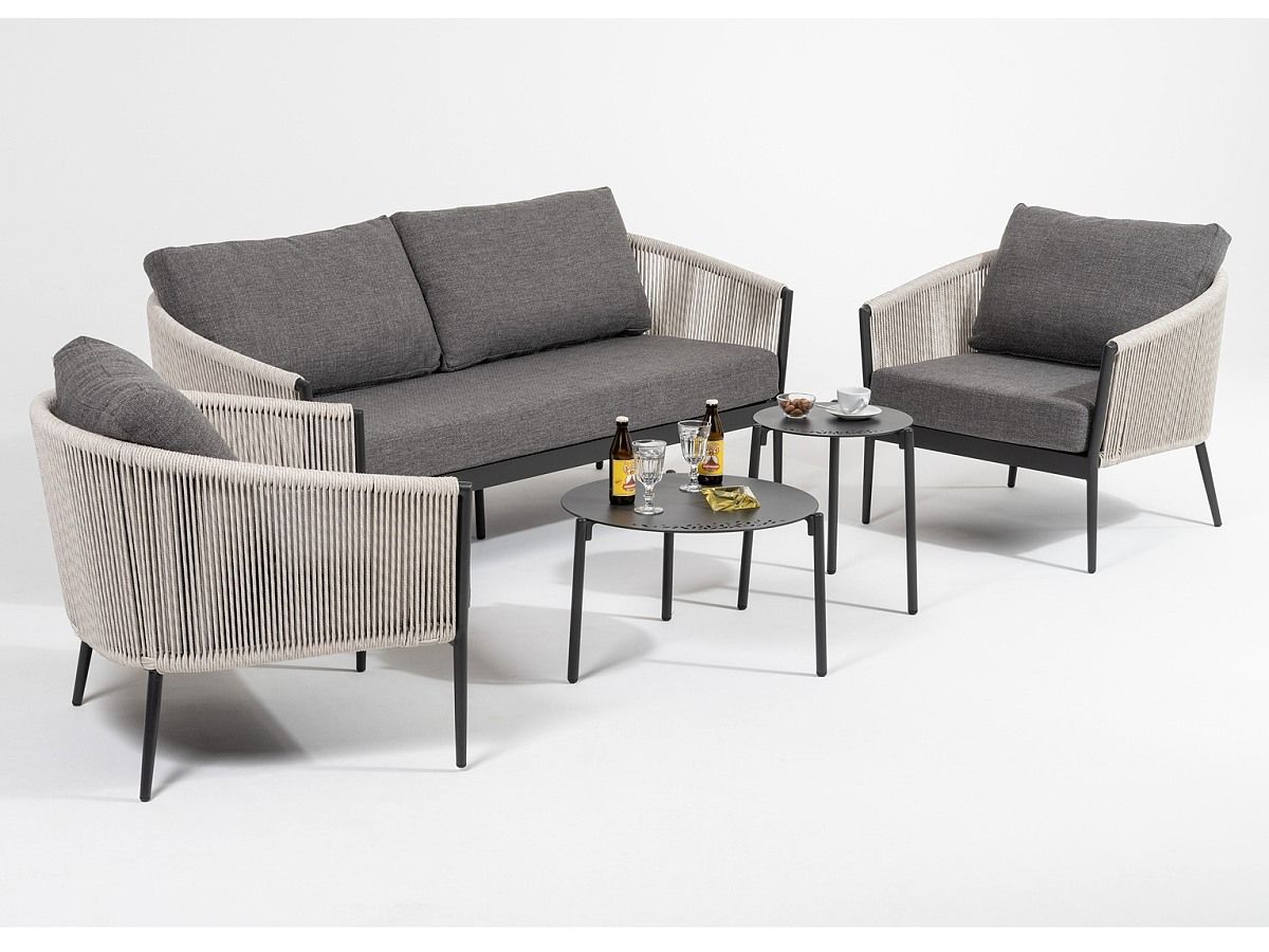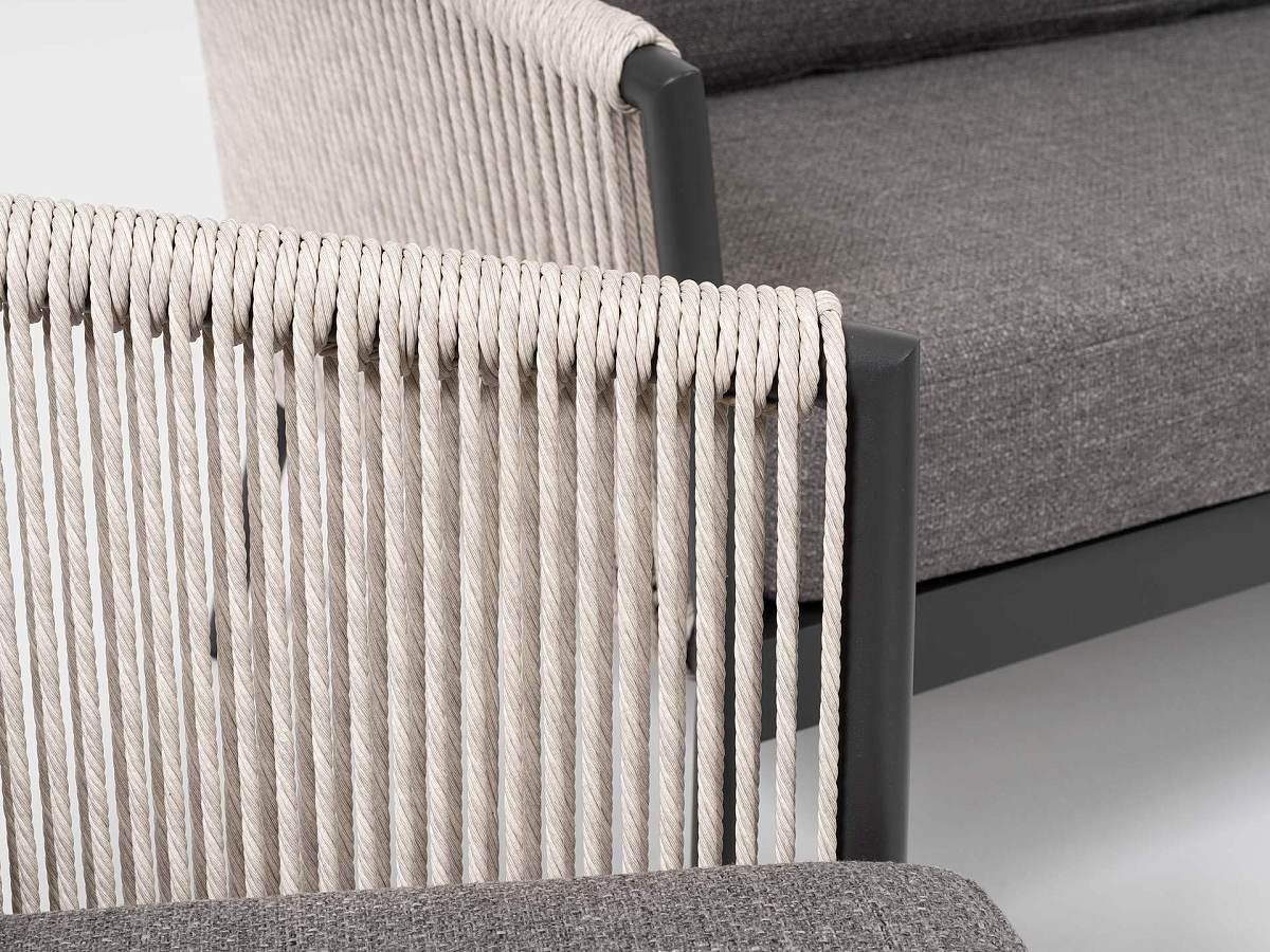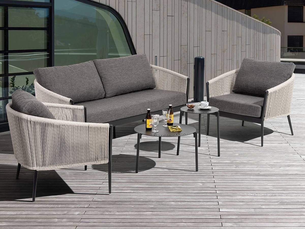 Úžasne pohodlná a dizajnová záhradná sedacia súprava Mango Antracit Hellgrau je ideálnym spoločníkom na dlhé letné posedenia. Konštrukcia sedacej súpravy je hliníková a je striekaná práškovou farbou vo farbe Antracit. Operadlá na kreslách a dvojsedačke sú ovinuté tkaným syntetickým lanom v svetlosivom odtieni, ktorý dodáva celému dizajnu nádych modernizmu. Podsedáky a opierkové vankúše sú tmavosivej farby a sú odolné voči poveternostným vplyvom. Konferenčné stolíky majú konštrukciu z hliníku v rovnakej farbe ako pri kreslách a trojsedačke. V tomto dizajne máme aj stoličky Mango ak by ste chceli zladiť sedaciu a stolovú súpravu.