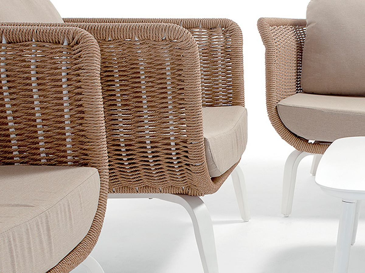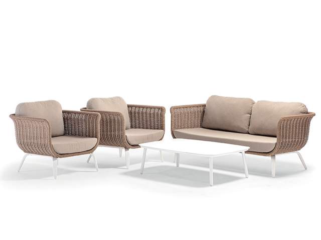 Elegantná a moderná záhradná sedacia súprava Melrose Natur Vás zaujme hneď na prvý pohľad. Konštrukcia sedacej súpravy je hliníková a je striekaná bielou práškovou farbou. Kreslá aj dvojsedačka sú ručne ovinuté pevným syntetickým lanom v naturálnom vzhľade. Matrace aj vankúše sú z materiálu Campagne Olefin s výplňou Quick Dry Foam. Sedacia súprava Melrose je dostupná v dvoch farebných prevedeniach: v elegantnej bielej konštrukcii s naturálnym syntetickým výpletom a v klasickej antracit farbe, ktorú nájdete v sekcii sedacie súpravy ako Melrose Rope.
