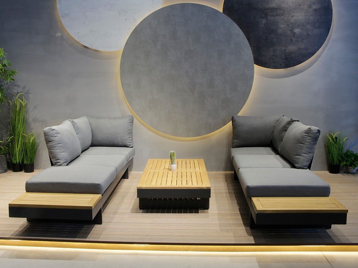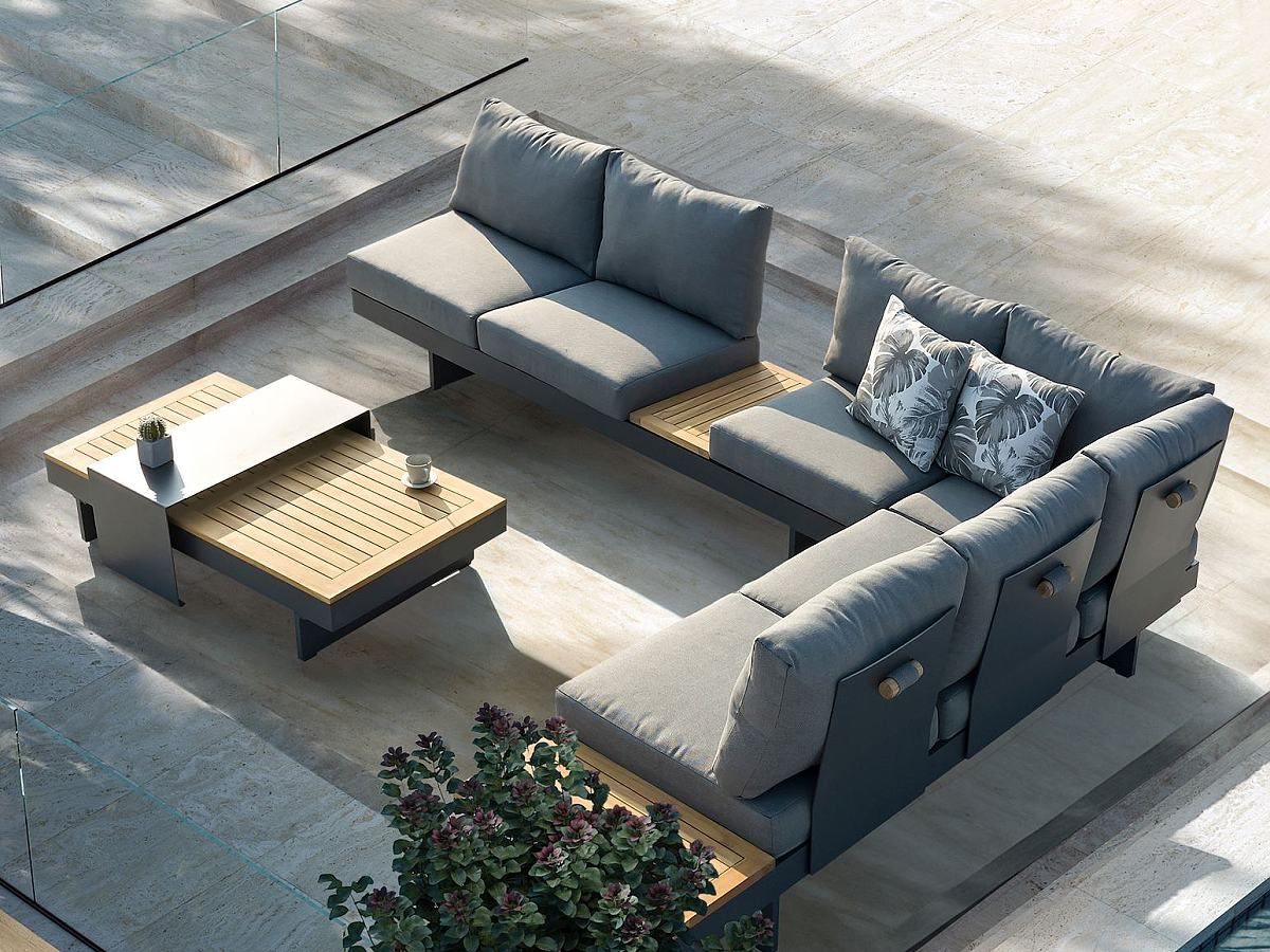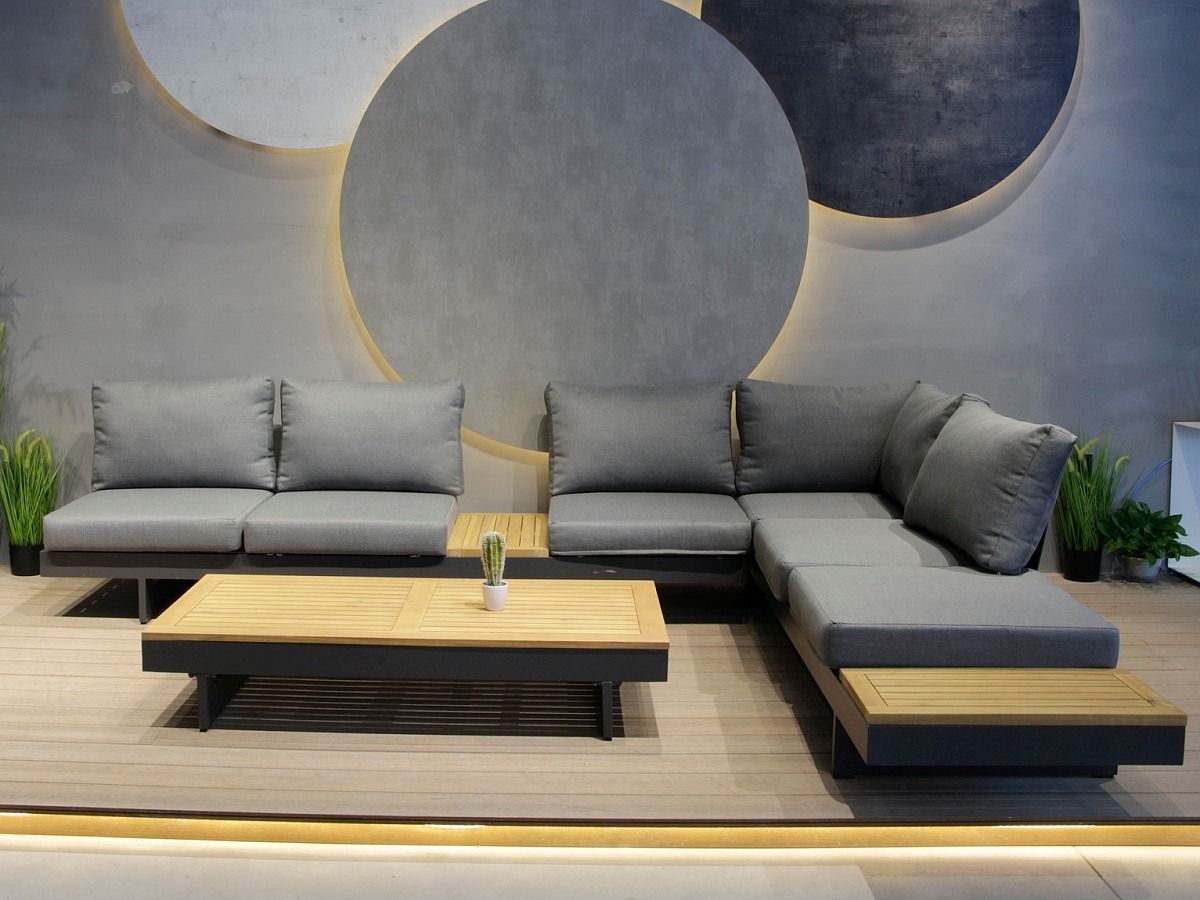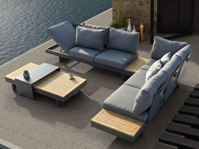 Elegantná a moderná rohová sedacia súprava Molise bude hviezdou každej terasy. Konštrukcia sedacej súpravy je hliníková v antracitovej farbe a elegantne ju na krajoch dopĺňa latovanie z akáciového dreva. Pohodlné vankúše a sedáky sivej farby iba pozdvihujú celkový dizajne tejto sedacej súpravy. Sedačku je možné nastaviť buď ako samostane stojace dve sedačky alebo ako rohovú sedaciu súpravu. Konce oboch elementov sa dajú naklápať a použiť ich teda ako pohodlné ležadlo.