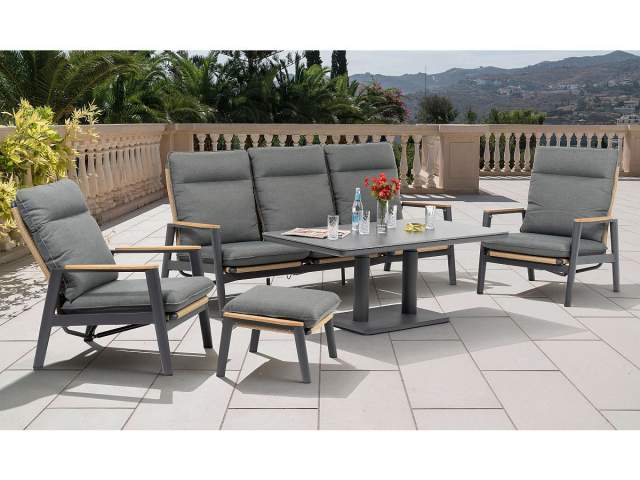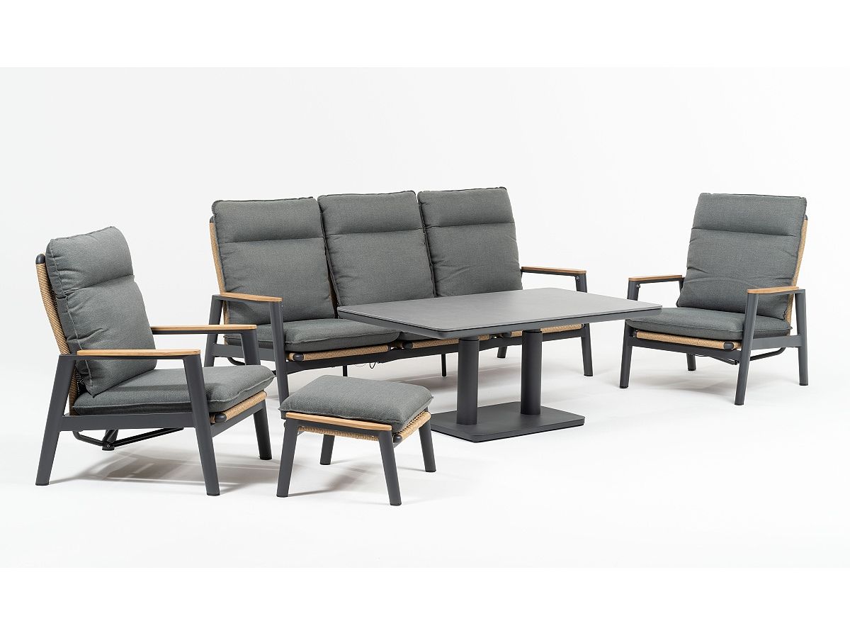 Očarujúca a pútavá sedacia súprava Oasis, je ideálnou voľbou na väčšie terasy kde môže vyniknúť v plnej svojej kráse. Sedacia súprava Oasis je ideálnym spojením sedacej a stolovej súpravy vďaka výškovo nastaviteľnému stolu (výšku stola nastavujte pomocou plynovej pružiny), vďaka ktorému si v pohodlí môžete vychutnať jedlo ako pri stolovej súprave ale aj letný drink či kávu pri nižšom nastavení stola. Stôl má povrchovú dosku z materiálu Sinterstone vo farbe Beige. Stôl je takmer bezúdržbový a veľmi odolný. Konštrukcia súpravy Oasis je z hlíníku, ktorý je striekaný práškovou farbou v antracitovom odtieni. Zadná strana kresiel a trojsedačky je ovinutá polypropylénovým výpletom v naturálnej farbe. Operadlá na kreslách aj trojsedačke sú z teakového dreva. Vankúše a podsedáky sú v šedej farbe a sú odolné aj v exteriérovom prostredí.