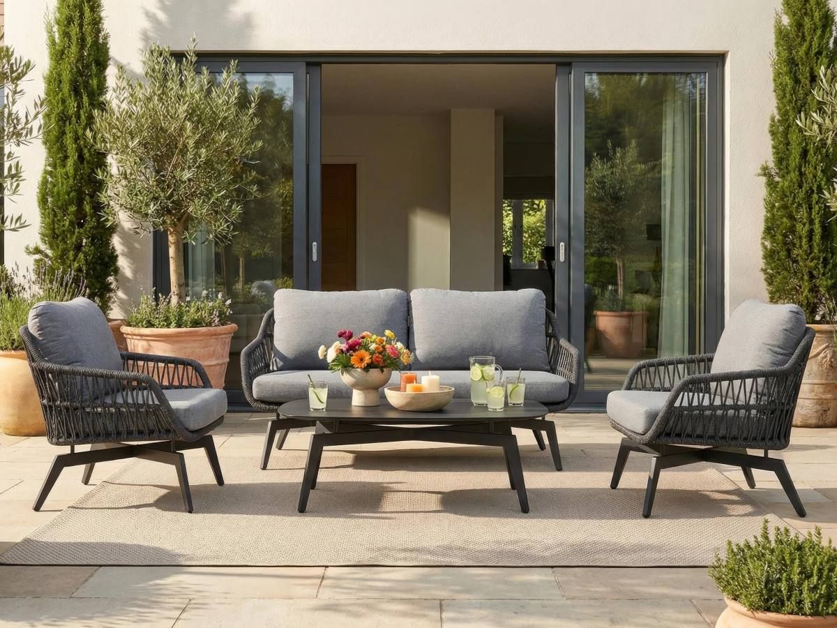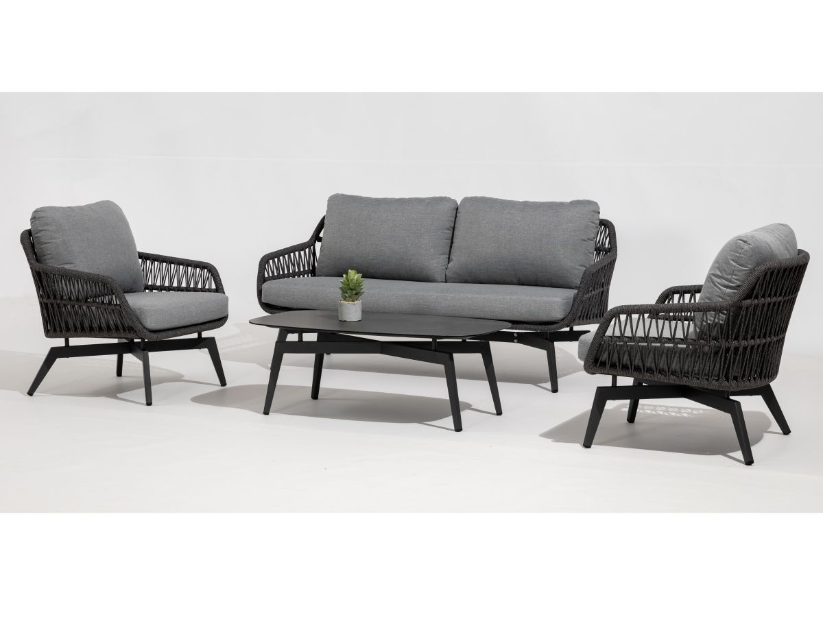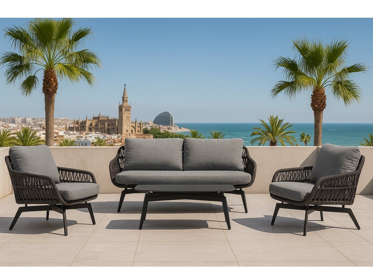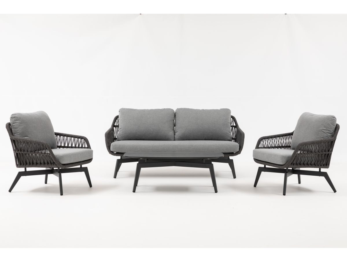 • Výplet: textilné laná v tmavosivej farbe, ktoré sú príjemné na dotyk, odolné voči UV žiareniu a dodávajú súprave moderný, vzdušný vzhľad.