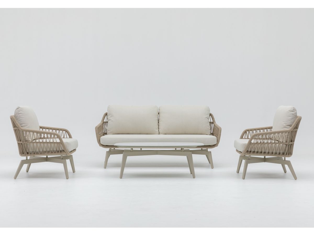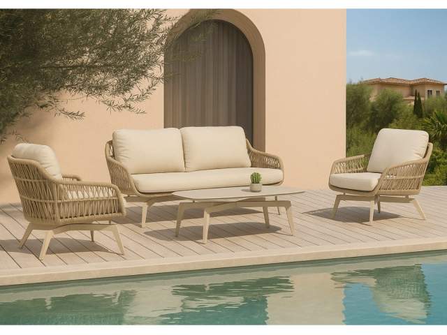 • Výplet: textilné laná v pieskovej farbe (Sand), ktoré sú UV stabilné a dodávajú nábytku prirodzený, teplý charakter.
