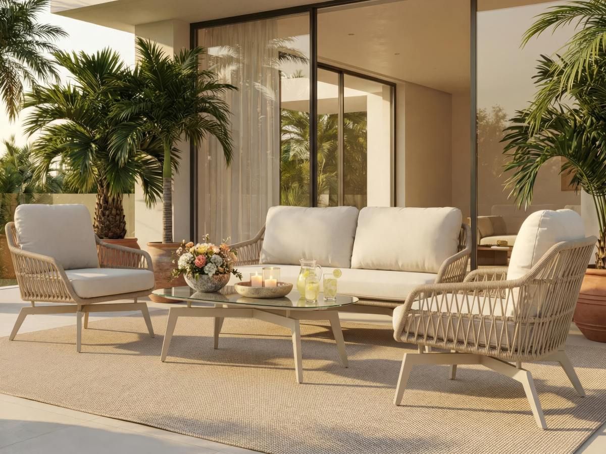 Sedacia súprava Sahara v prevedení Sand vnáša do exteriéru hrejivú, organickú estetiku, ktorá dokonale splýva s prírodným prostredím terás a záhrad. Vďaka kombinácii jemných pieskových tónov výpletu a moderného odtieňa Greige pôsobí súprava mimoriadne svetlo a prívetivo. Je navrhnutá tak, aby vytvorila relaxačnú oázu plnú svetla, pričom si vďaka špičkovým materiálom zachováva vysokú odolnosť a stálosť farieb aj pri intenzívnom používaní na priamom slnku.