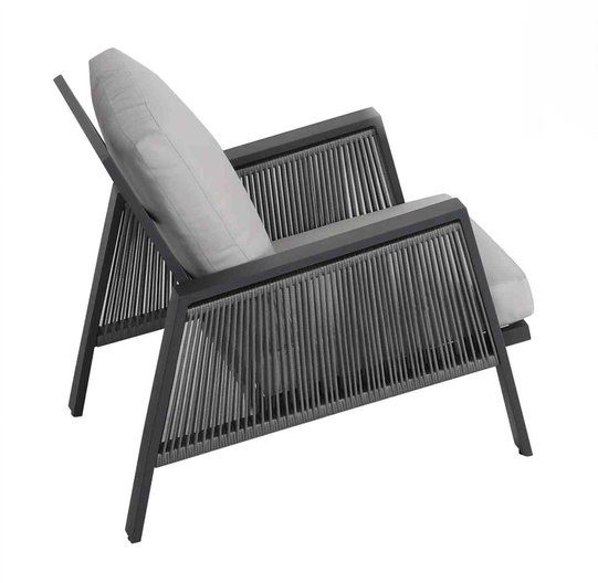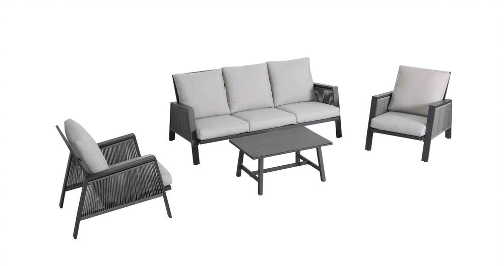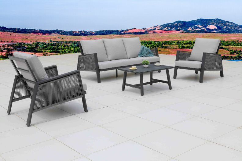 Krásna a moderná záhradná sedacia súprava Sicily je typickým príkladom súčasného ponímania záhradného nábytku. Konštrukcia sedacej súpravy je z hliníku a je striekaná práškovou farbou. Opierkové časti kresiel a trojsedačky sú ovinuté svetlošedými lanami. Podsedáky a opierkové vankúše sú impregnované a vhodné na používanie v exteriéry, niesú ale vodeodolné, a tak ich musíte pred dažďom schovávať alebo sedaciu súpravu prikryť ochrannou plachtou. Doplnkom sedacej súpravy je konferenčný stolík, ktorý má hliníkovú konštrukciu a stolovú dosku z tvrdeného skla s keramickým povrchom.