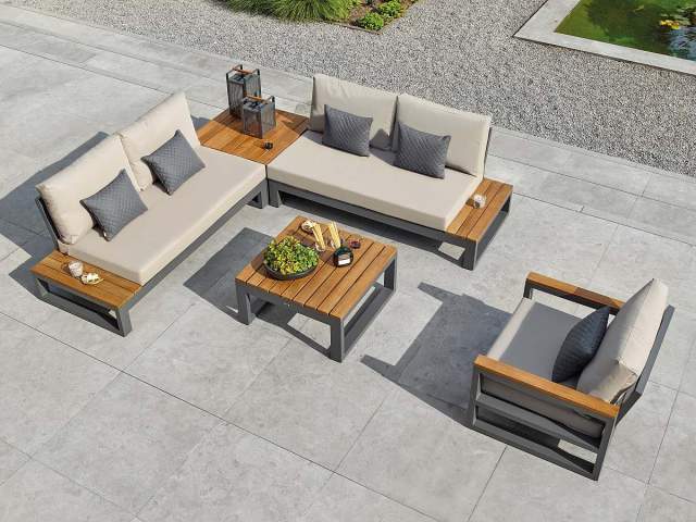 Luxusná a prémiová rohová sedacia súprava Soho Corner Special ST dodá Vašej terase punc dokonalosti. Sedacia súprava má hliníkový rám doplnený podsedákmi a vankúšmi z prémiového materiálu All Weather Soltex Cushions. Dvojsedačky sú elegantne ukončené odkladacím stolíkom z teakového dreva najvyššej kvality. Rohový modul je nahradený daľším stolíkom, vďaka ktorému vznikne netradičná ale krásna rohová súprava. Operadlá na kresle sú tiež z prémiového teakového dreva. Podsedáky a opierkové vankúše sú dostupné v 5 farebných prevedeniach, ktoré Vám vieme na dotaz zaslať. Sedacia súprava je dostupná aj vo farbe antracit a white.