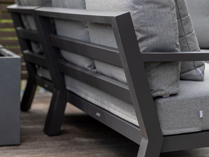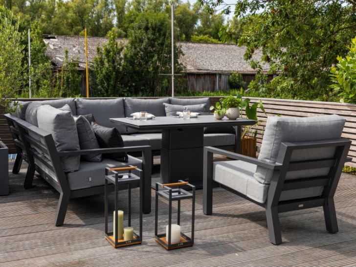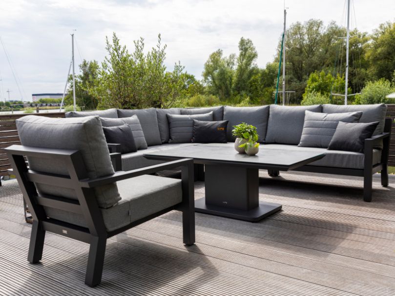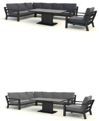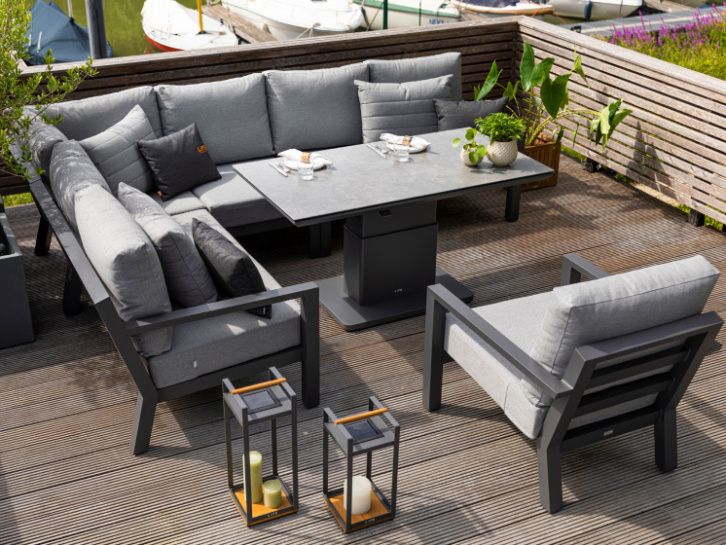 Rohová záhradná sedacia súprava Timber Corner lava Luka má hliníkovú konštrukciu striekanu práškovou farbou. Podsedáky aj opierkové vankúše sú z odolného materialu SOLTEX alebo ALL WATHER CUSHIONS vhodné do každého počasia. Zaujímavosťou je výškovo nastaviteľný stolík, ktorý jednoduchým ovládaním nohou viete ľahko dvíhat alebo znižovať. Pri vyššom nastavení sa pri stole pohodlne najete. Ak si chcete len vychutnať šálok kávy alebo pohárik šampanského, bude Vám dokonale stačiť ak stolík dáte nižšie a bude tak plnit funkciu konferenčného stolíka, ako je tak tomu pri lounge sedaciách súpravách. Stolík má keramickú stolovú dosku (Ceramic Concrete look), takže je takmer bezúdržbový. Podsedáky a opierkové vankúše sú dostupné v troch prevedeniach a to Carbon All Weather, Mist Grey Soltex a Graphite Soltex