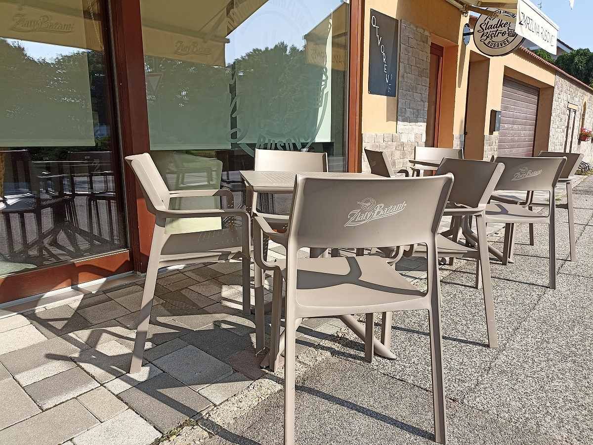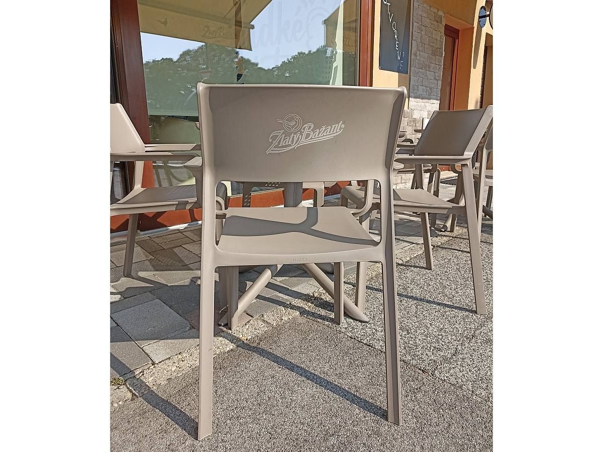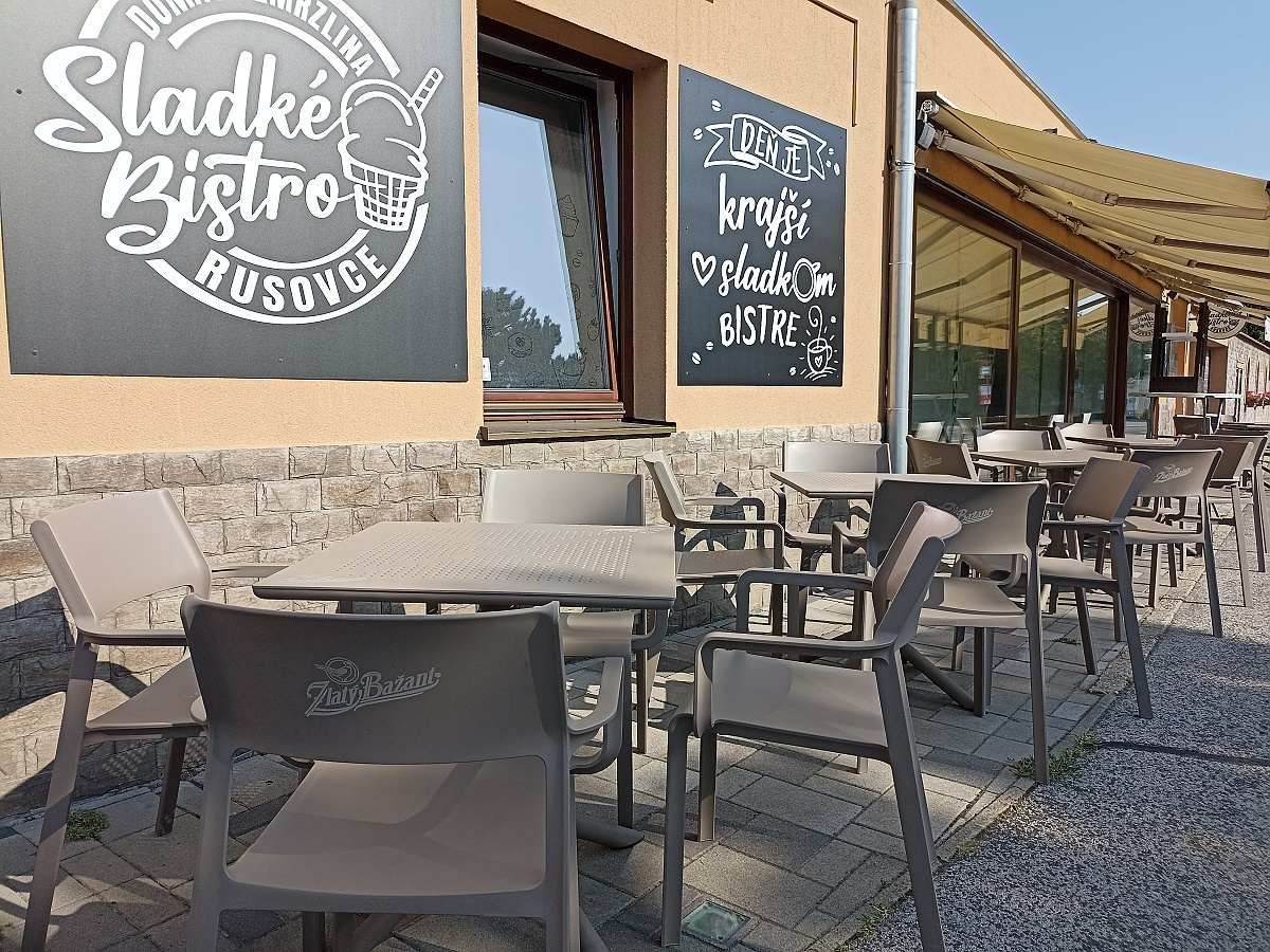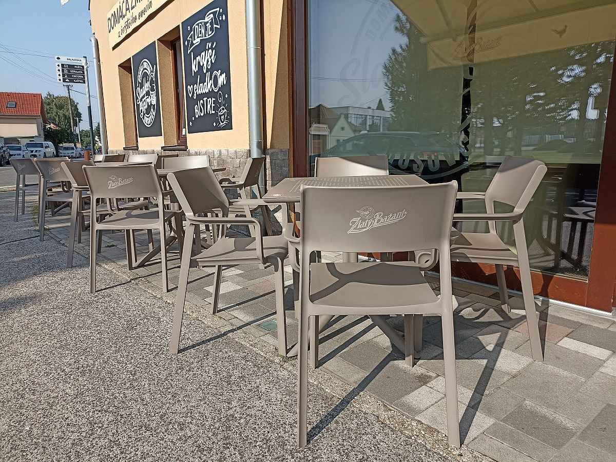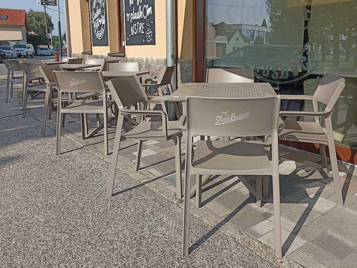 Vybavenie modernej prevádzky Sladké Bistro v Rusovciach odolnými stoličkami Trill Armchair a stolami Clip vo farbe Tortora.
