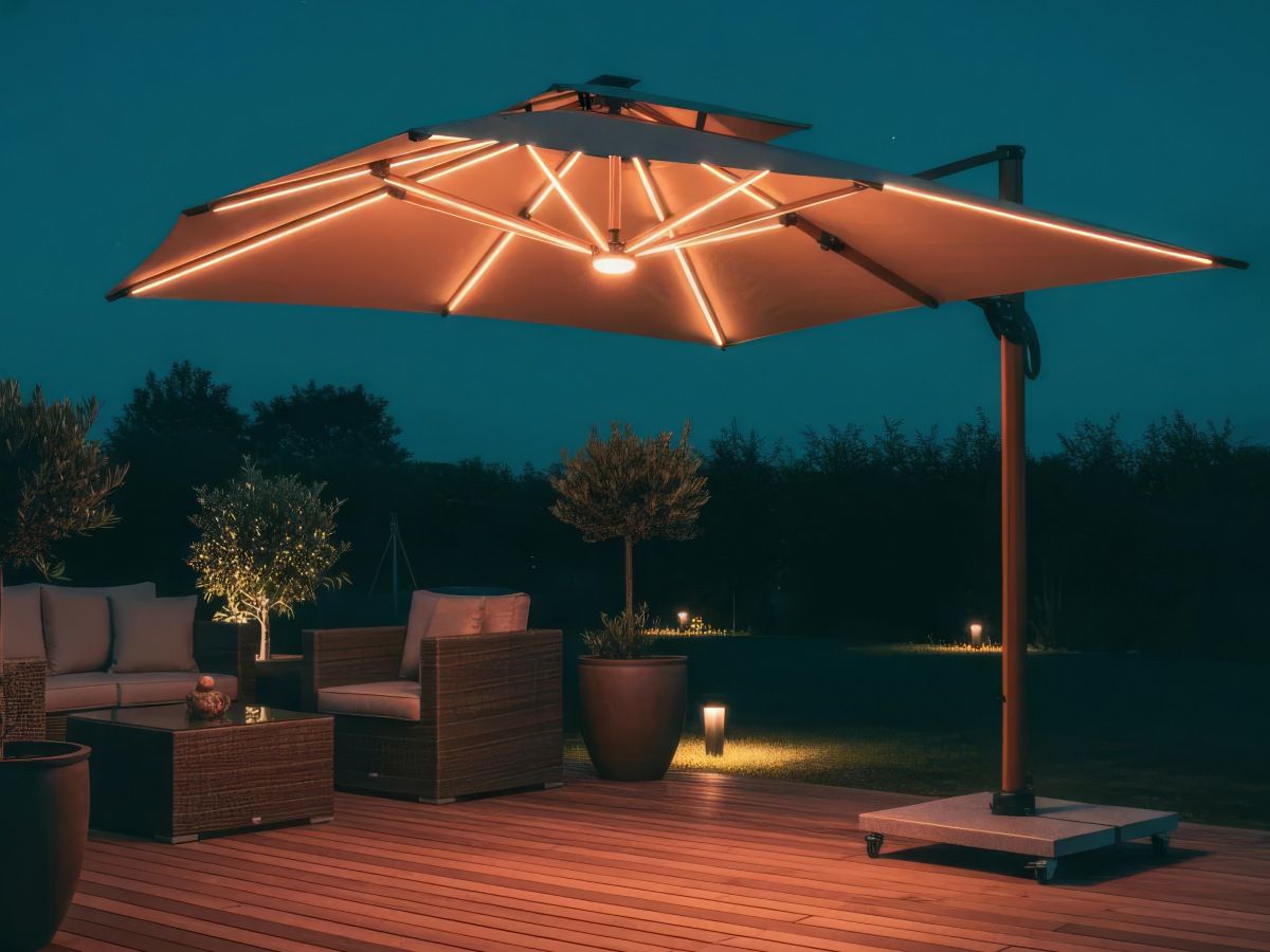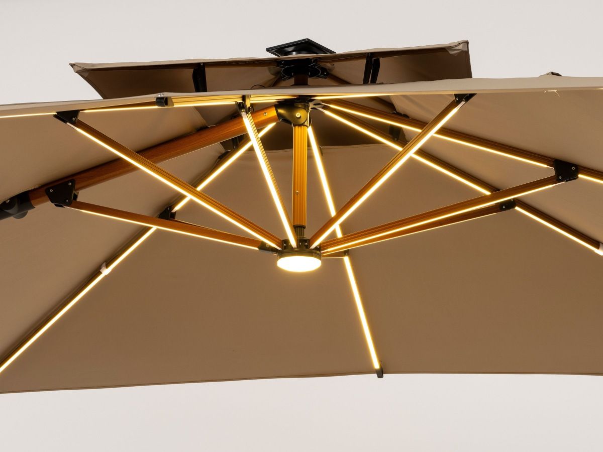 Integrované LED osvetlenie: LED pásiky v ramenách slnečníka pre príjemné večerné osvetlenie.