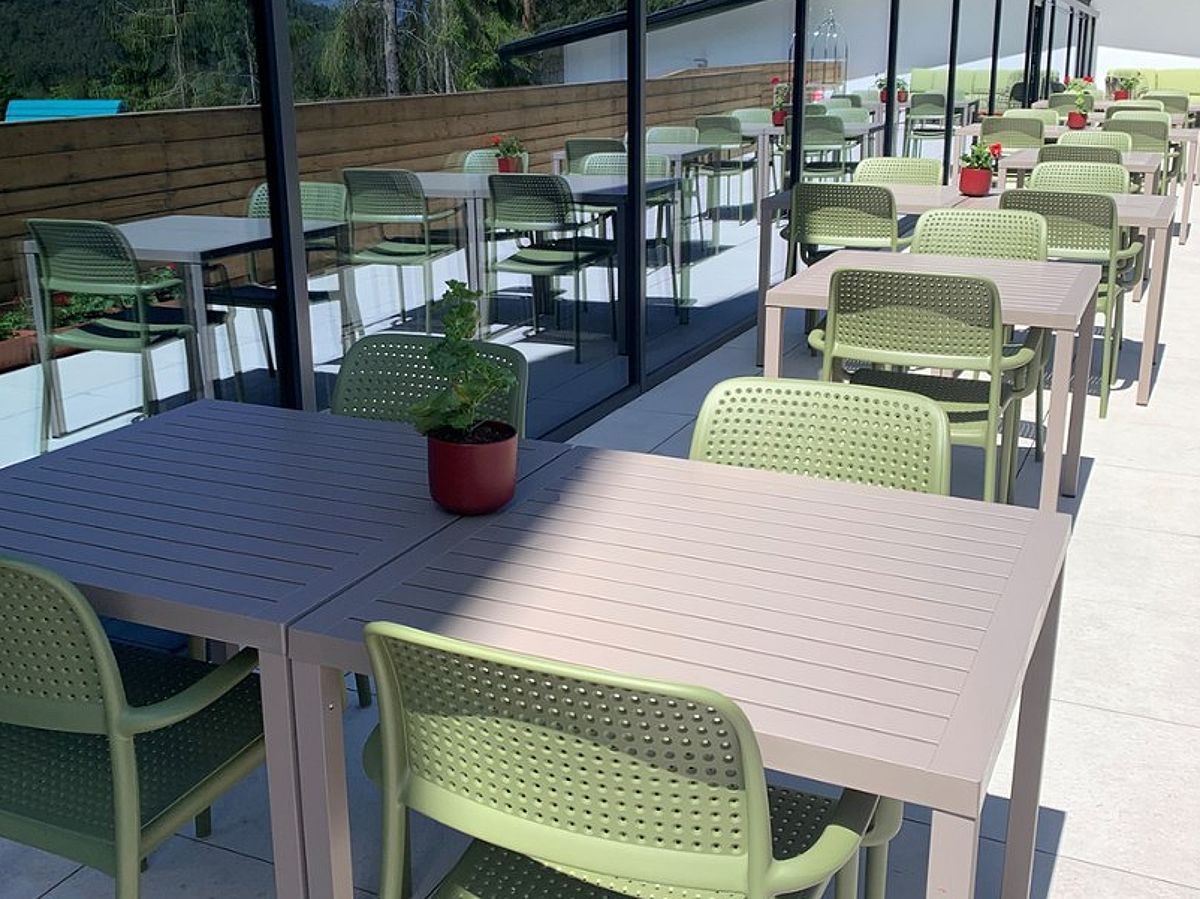 Vybavenie krásnej terasy nového moderného hotelu Fitak v Jánskej doline. Odolné stoličky Bora Armchair v dvoch krásnych kombináciach Tortora a Agave, ktoré dopĺňajú praktické stoly Cube 80 Tortora.