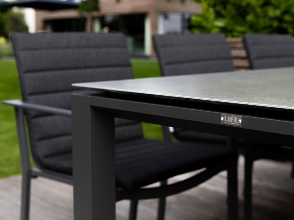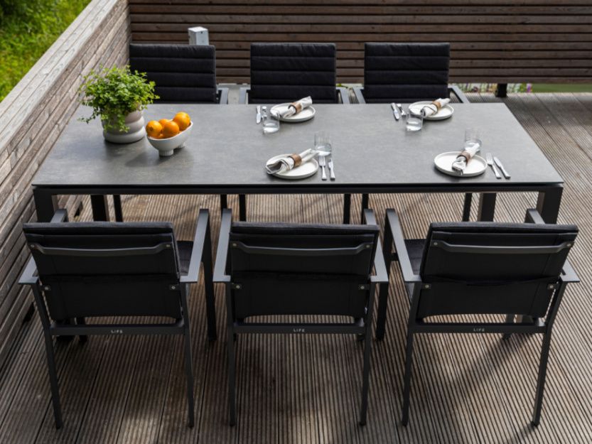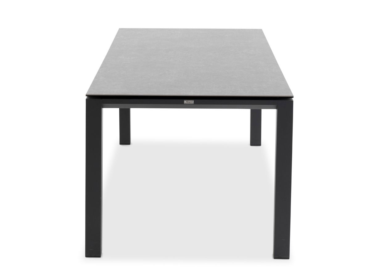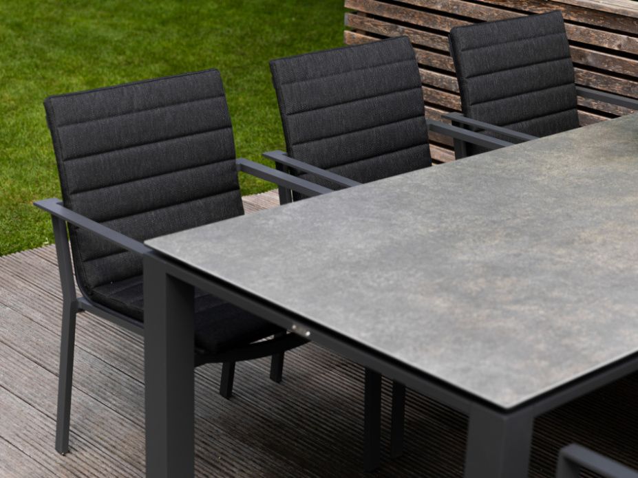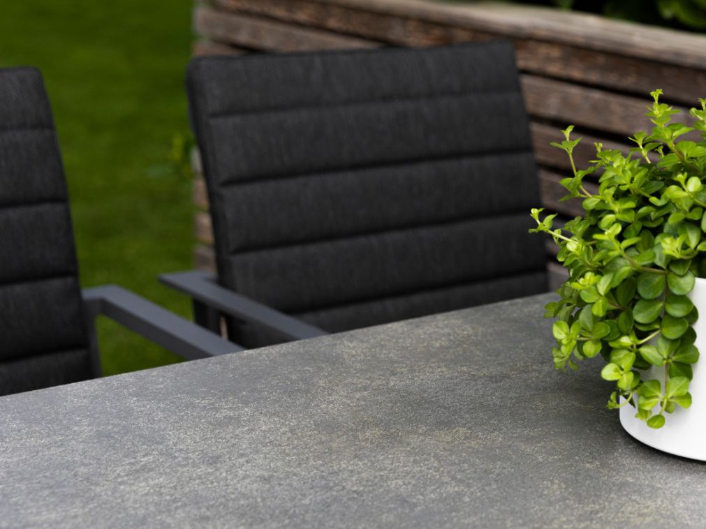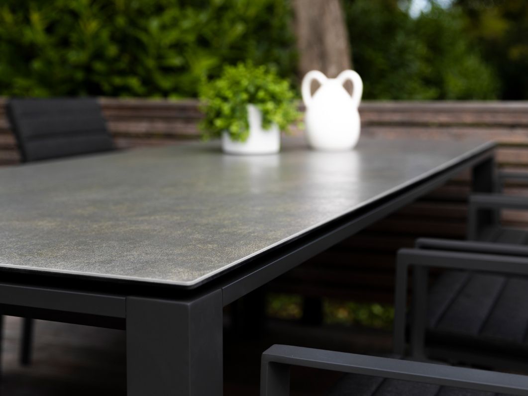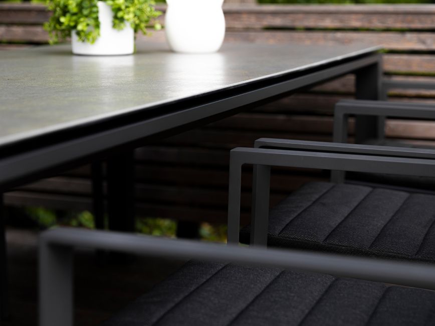 Elegantný záhradný jedálenský stôl Concept Ceramic. Konštrukcia stola je hliníková striekaná práškovou antarcitovou farbou. Stolová doska je z inovatívneho materiálu Ceramic Concrete Look. . Konštrukcia stola je dostupná aj v bielej farbe