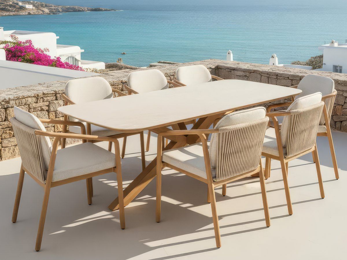 Stôl Ondara predstavuje vrcholnú ukážku dizajnu, kde sa snúbi vzhľad masívneho dreva s technologickou vyspelosťou moderných materiálov. Jeho dominantná podnož s prekríženými nohami v štýle „pavúk“ dodáva stolu nielen nezameniteľný charakter, ale zaručuje aj výnimočnú stabilitu. Vďaka jemnému dekoru Ivory na doske zo Sinterstonu pôsobí stôl mimoriadne elegantne a svetlo, pričom ponúka odolnosť, ktorú od záhradného nábytku očakávate. Je to ideálna voľba pre tých, ktorí milujú teplo prírodných materiálov, no preferujú bezúdržbové riešenia.