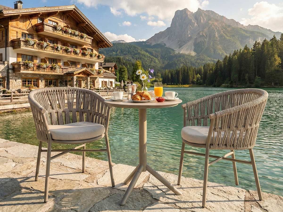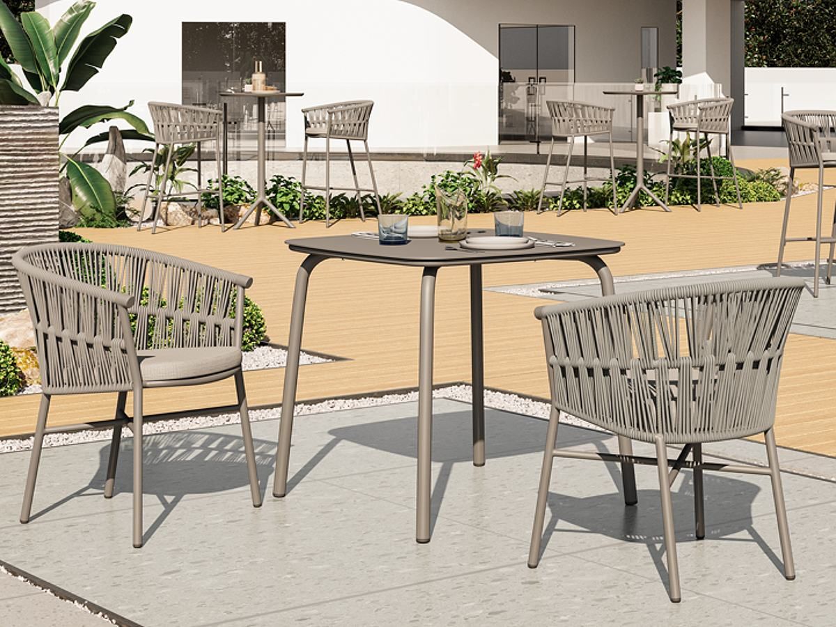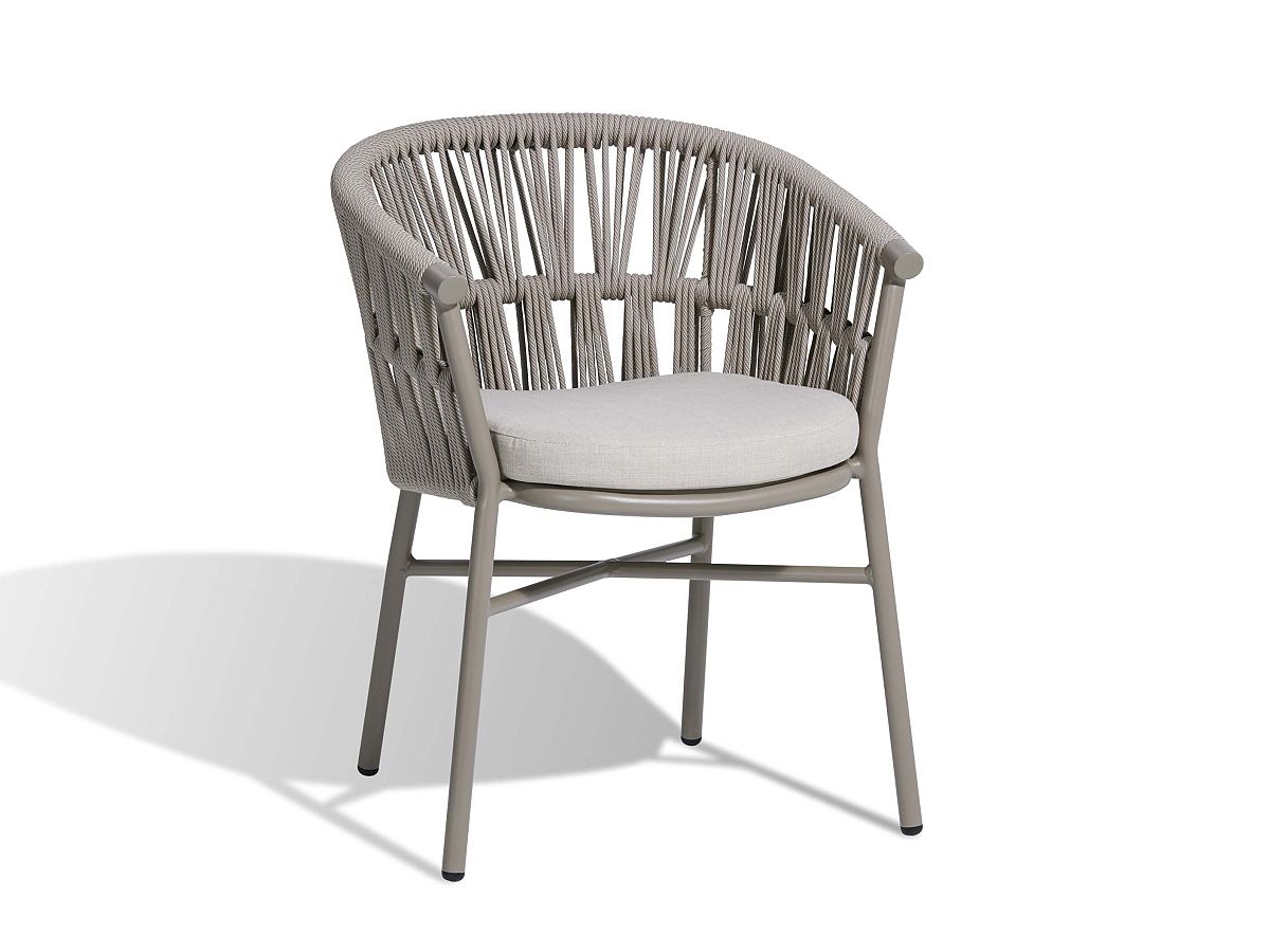 Stolička Fan v sebe spája subtílnu hliníkovú konštrukciu a vizuálne pútavý šnúrový výplet. Jemná kombinácia farby taupe a béžového melíru pôsobí teplo a útulne, vďaka čomu kreslo okamžite zjemní vzhľad každej terasy. Ergonomicky tvarované operadlo plynule prechádza do podrúčok, čo spolu s mäkkým vankúšom zaručuje pohodlie aj pri dlhom stolovaní.