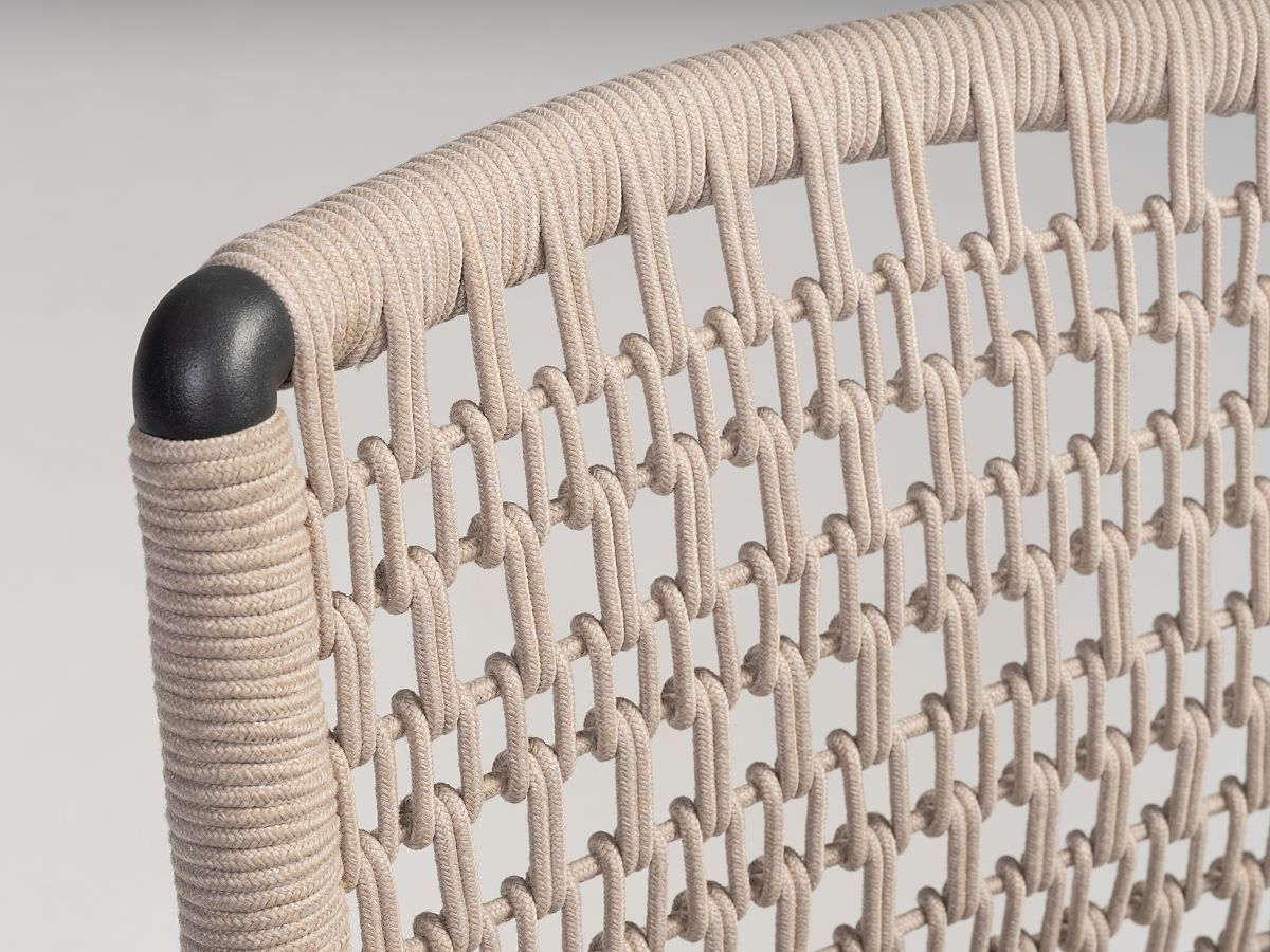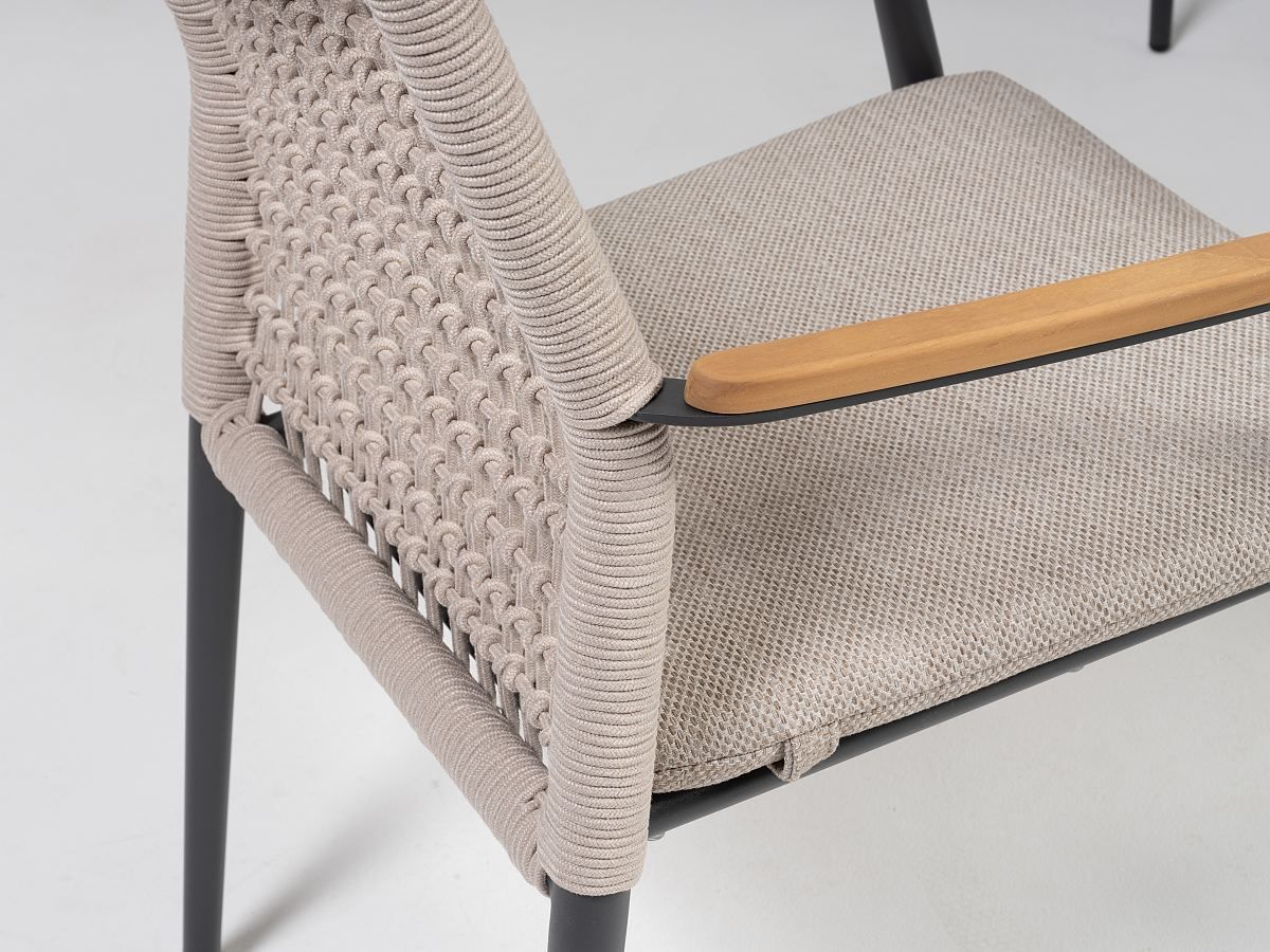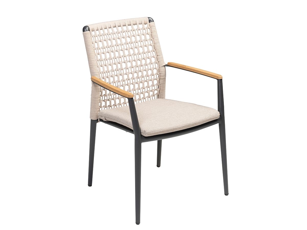 Vzdušná a veľmi elegantná stolička Grenada je vďaka použitým materiálom ideálna pre terasy hotelov a reštaurácií, ale určite bude hviezdou aj terasy rodinného domu. Stolička Grenada má hliníkovú konštrukciu v antracitovej farbe , operadlo je ručne ovinuté syntetickým lanom v béžovej farbe a dodáva mu tak moderný vzhľad. Podsedák je vodeodolný a tak sa nemusíte obávať ani letného daždu. Podrúčky sú z teakového dreva. Stolčika Grenada je dostupná v dvoch farebných prevedeniach. .