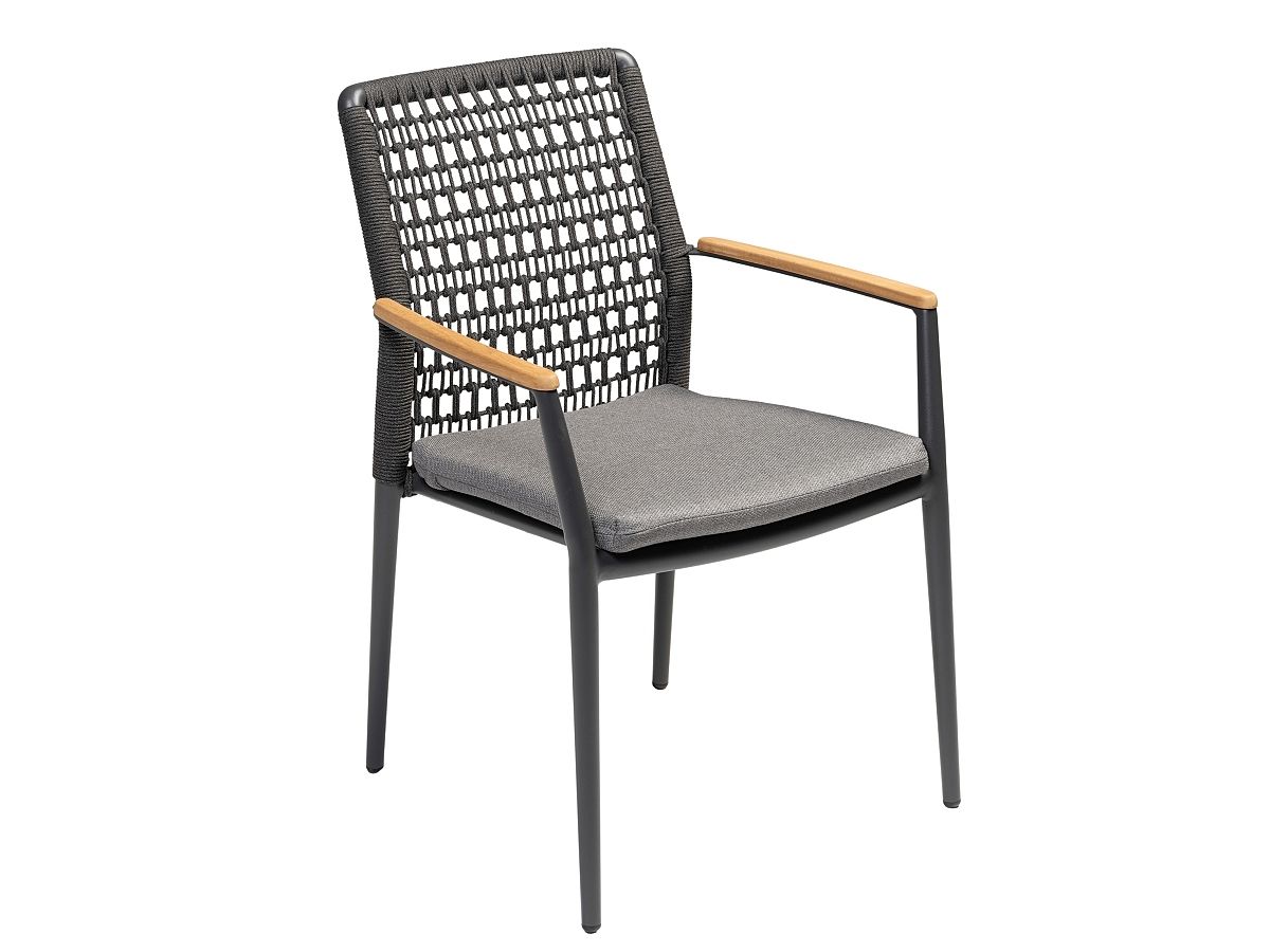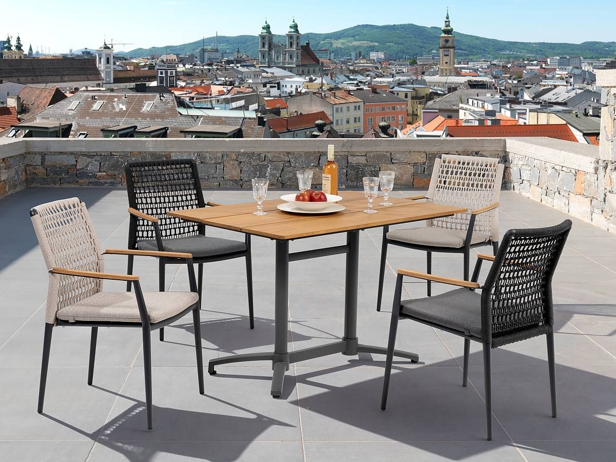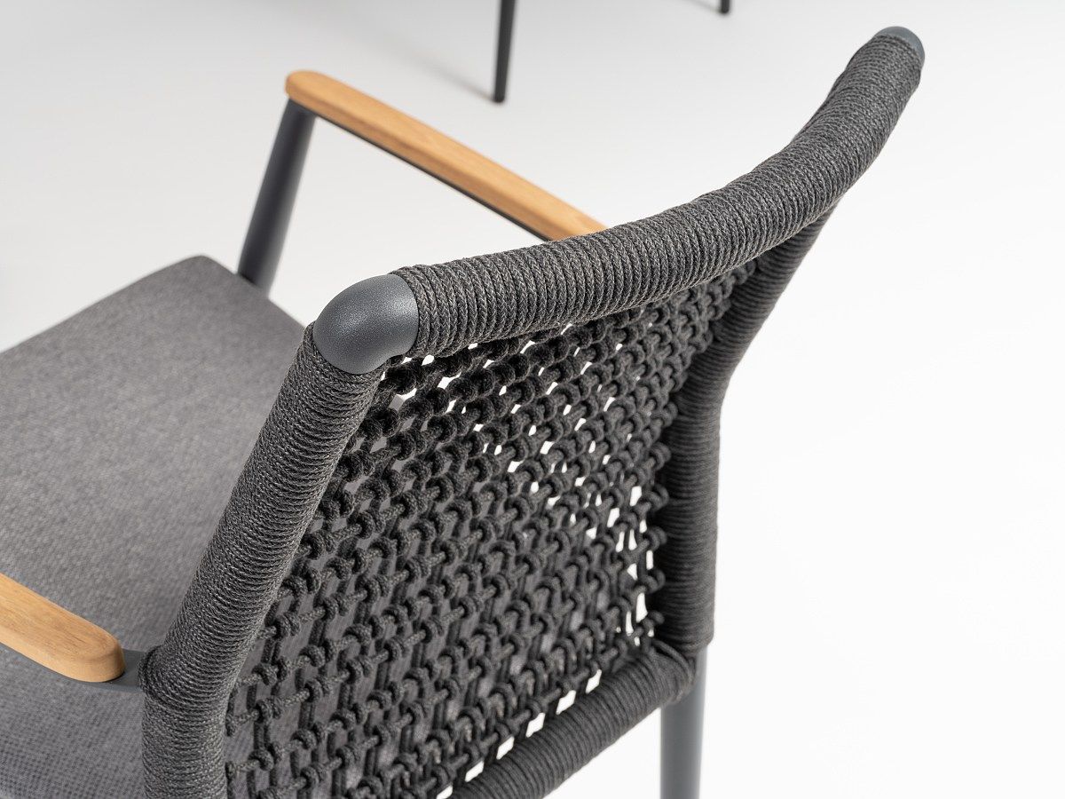 Vzdušná a veľmi elegantná stolička Grenada je vďaka použitým materiálom ideálna pre terasy hotelov a reštaurácií, ale určite bude hviezdou aj terasy rodinného domu. Stolička Grenada má hliníkovú konštrukciu v antracitovej farbe , operadlo je ručne ovinuté syntetickým lanom v tmavošedej farbe a dodáva mu tak moderný vzhľad. Podsedák je vodeodolný a tak sa nemusíte obávať ani letného daždu. Podrúčky sú z teakového dreva. Stolička Grenada je dostupná v dvoch farebných prevedeniach. .