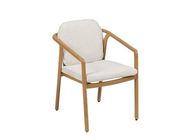 Stolička Ondara je stelesnením elegancie, ktorá v sebe spája teplý vzhľad prírodného teakového dreva s výhodami moderného hliníka. Vďaka technológii Heat Transfer, ktorá verne imituje textúru dreva, a jemne zaobleným opierkam na ruky pôsobí stolička veľmi príjemne a naturálne. Vertikálny výplet jej dodáva moderný vizuálny akcent, zatiaľ čo štruktúrované polstrovanie zabezpečuje vynikajúci komfort. Je to ideálna voľba pre tých, ktorí hľadajú štýlový, no nenáročný nábytok, ktorý v priestore vytvorí útulnú atmosféru.