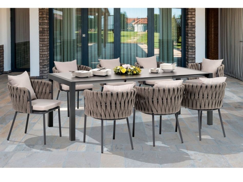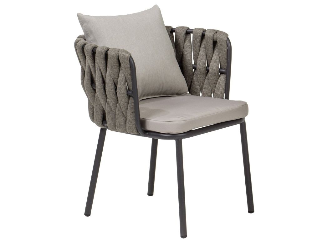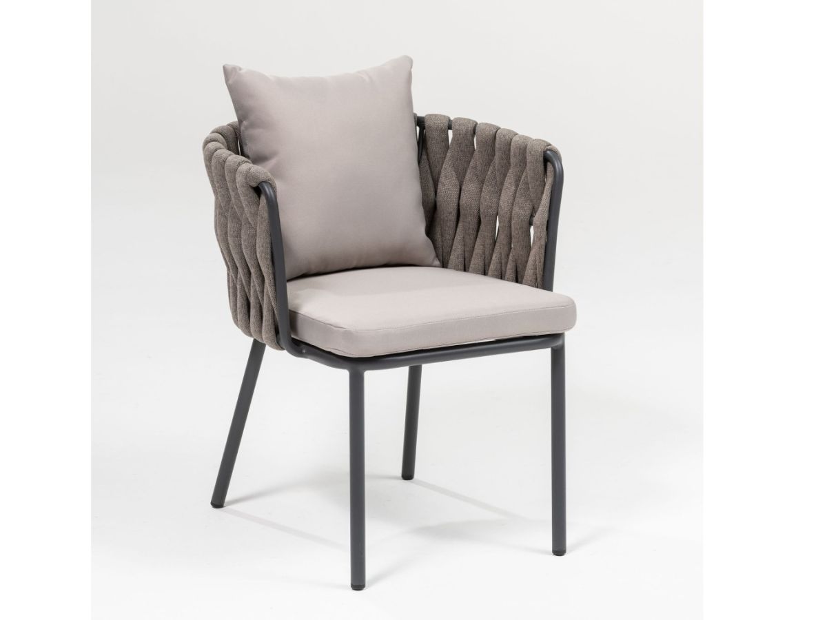 Krásna a moderná záhradná stolička Twist Armchair je tou pravou voľbou na terasy reštaurácií, barov, kaviarní ale aj hotelových terás a balkónov. Stolička ma hliníkový rám v antracitovej farbe a je ovinutá hrubým textilným rýchloschnúcim lanom s gumenným jadrom. Podsedák a opeirkový vankúš je v svetlosivej farbe, nieje vodeodelný.