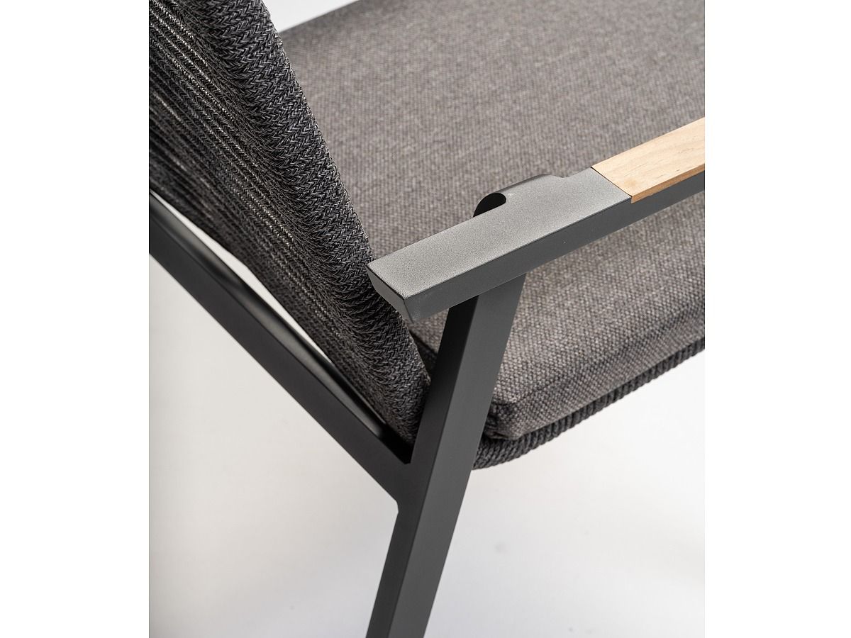 Vzdušná a veľmi elegantná stolička Woody je vďaka použitým materiálom ideálnou voľbou na terasy moderných domov. Stolička Woody má hliníkovú konštrukciu v antracitovej farbe , operadlo je ručne ovinuté syntetickým lanom v tmavošedej farbe a dodáva mu tak moderný vzhľad. Podsedák je v svetlosivej farbe a je odolný voči poveternostným vplyvom. Podrúčky sú z olejovaného borovicového dreva.