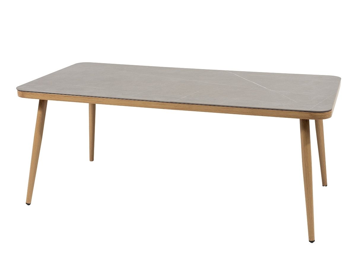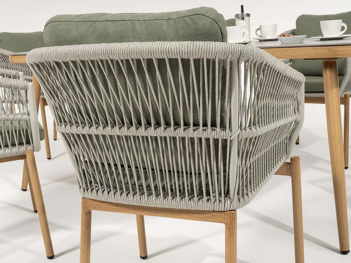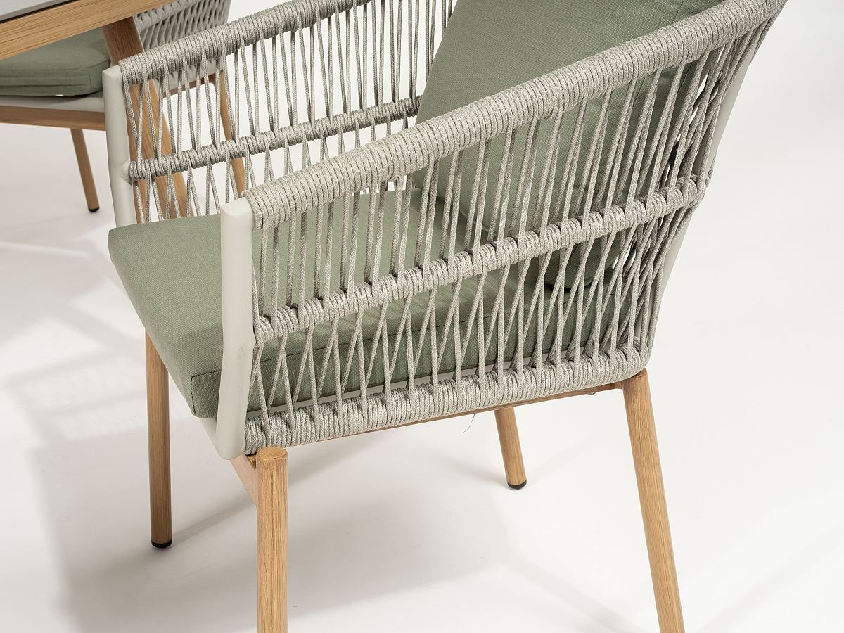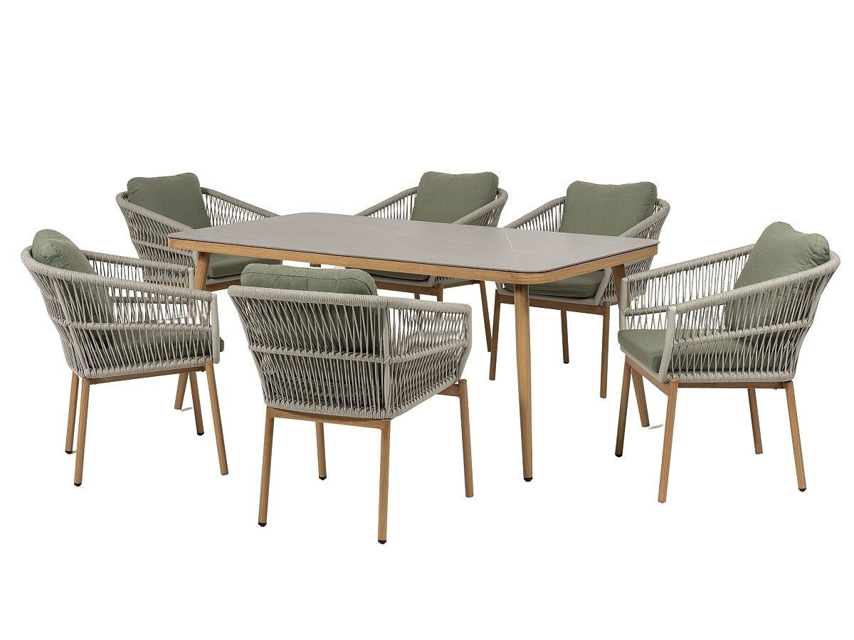 Okúzlujúca a moderná stolová súprava Alicante bude dokonalým miestom na letné posedenia s priateľmi či rodinou. Stôl má hliníkový rám striekaný práškovou farbou v drevennom dekore a stolová doska je zo špeciálneho materiálu Sinterstone o hrúbke 6mm (pod vysokým tlakom stlačený kamenný granulát), ktorý imituje svetlosivý mramor. Stolička ma hliníkový rám v drevennom dekore a je ovinutá textilnými svetlosivými šnúrami, ktoré sú odolné voči poveternostným vplyvom. Podsedák aj opierkový vankúš sú v zelenom odtieni a sú odolné voči poveternostným vplyvom.