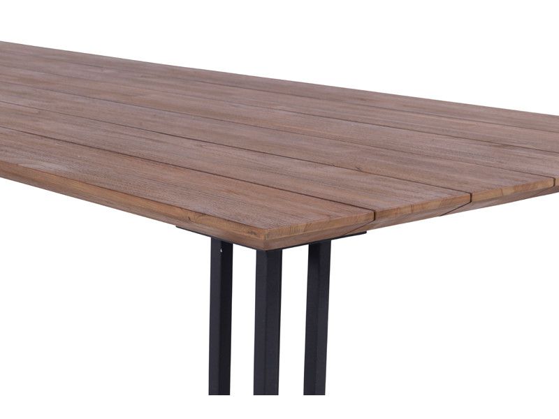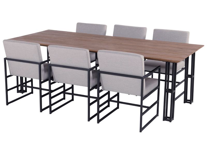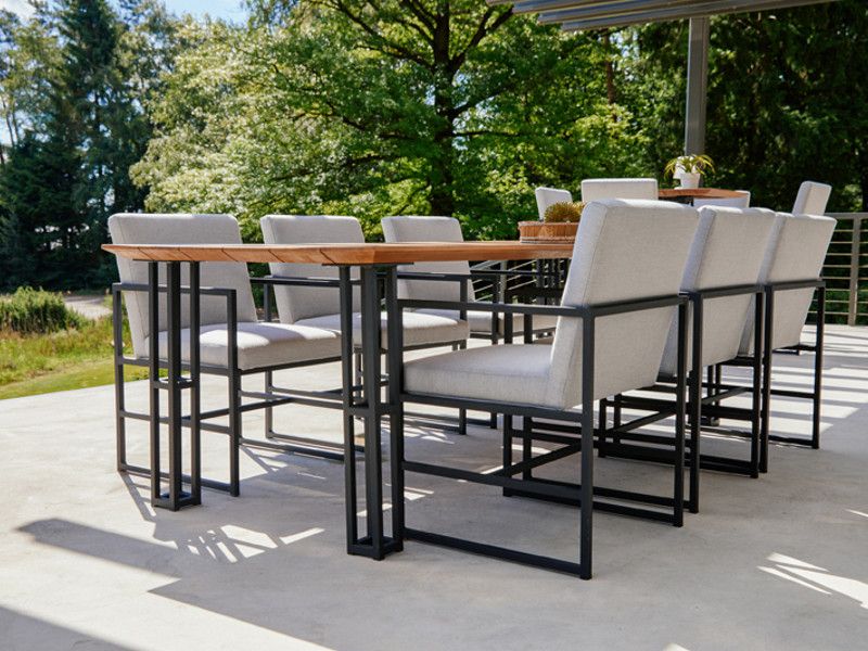 Nádherná záhradná stolová súprava Amsterdam Vás zaujme svojím minimalistickým industriálnym štýlom, ktorý elegantne dopĺňa krásny jedálenský stôl s teakovou doskou. Konštrukcia stolovej súpravy je z hliníku a je doplnená o pohodlné podsedáky, ktoré majú quick dry foam (rýchloschnúci materiál), takže môžu byť celoročne vonku a nevadí ím ani dážď. K stolovej súprave je v rovnakom štýle robená aj sedacia súprava Amsterdam ak by ste chceli mať jedálenskú súpravu aj sedaciu súpravu v jednom štýle.