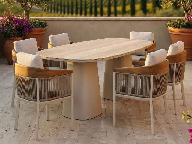 Stolová súprava Bienno Beluga je navrhnutá pre náročných klientov, ktorí hľadajú nadčasovú eleganciu v hrejivých prírodných tónoch. Kombinácia svetlého travertínu na stole a jemných akcentov teakového dreva na kreslách vytvára prestížny vizuál, ktorý rozžiari každú terasu, lounge zónu alebo exkluzívnu hotelovú záhradu.