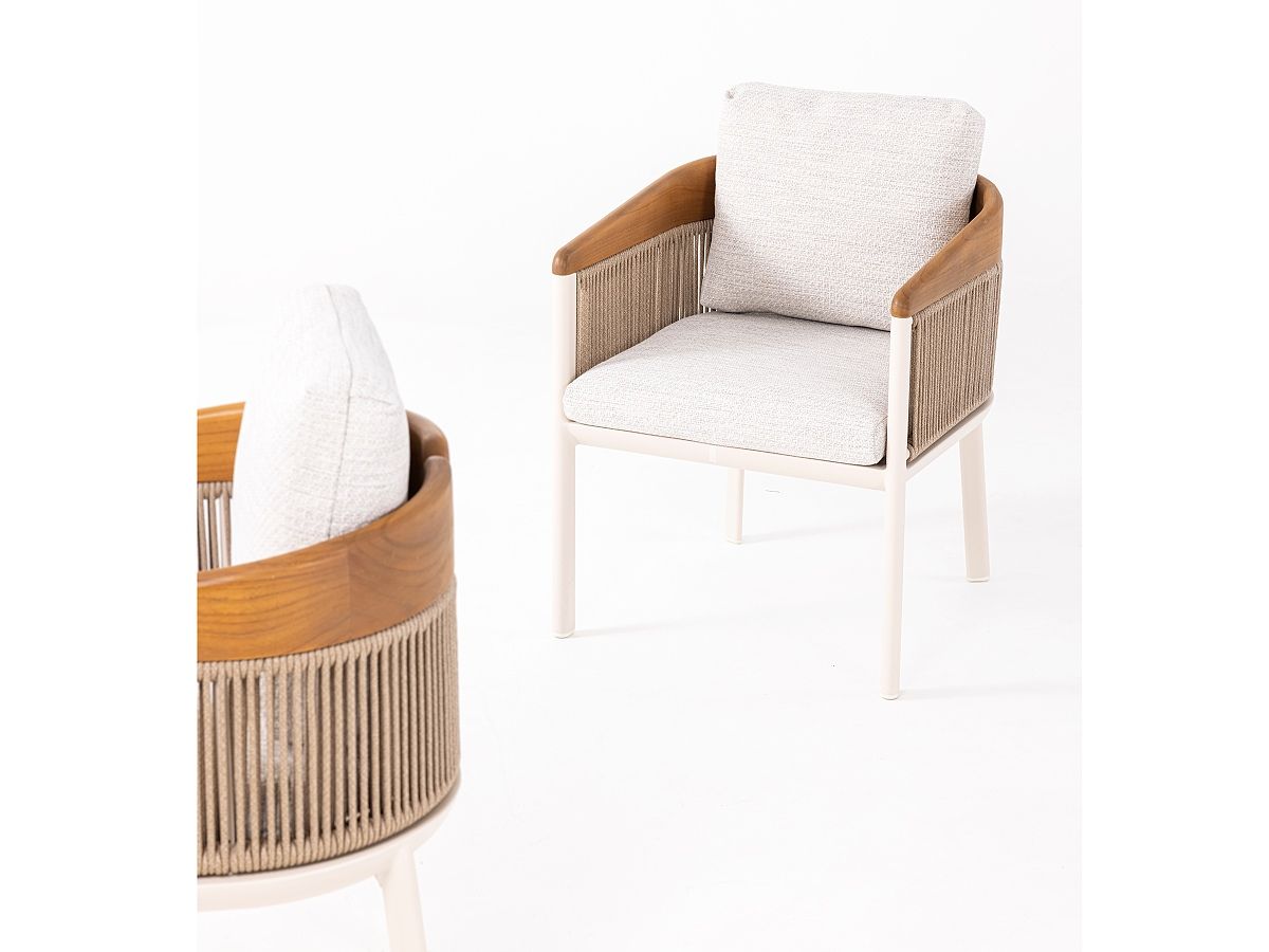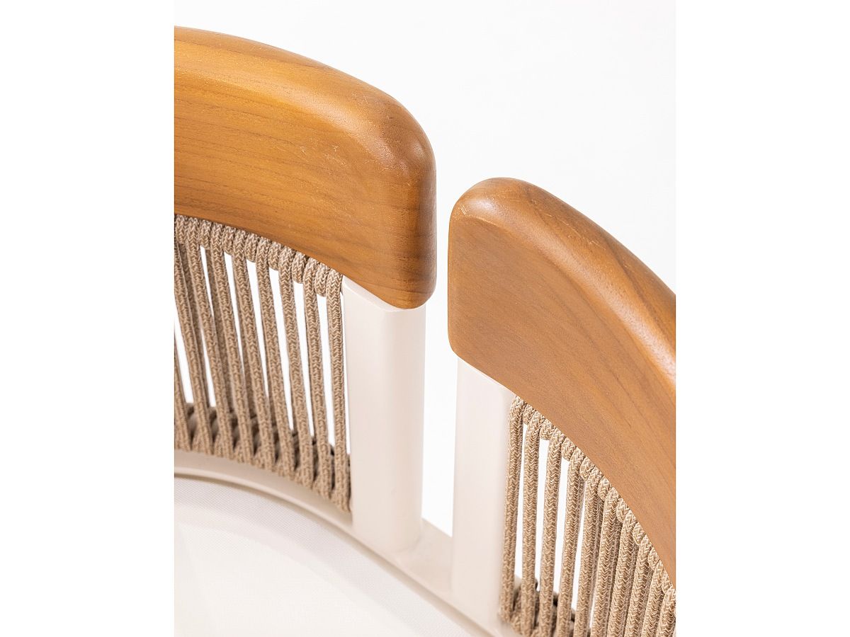 • Konštrukcia: Hliníkový rám v jemnom odtieni Ivory (slonová kosť), doplnený o opierky rúk z pravého teakového dreva, ktoré dodávajú dotyk prírody a hrejivosti.