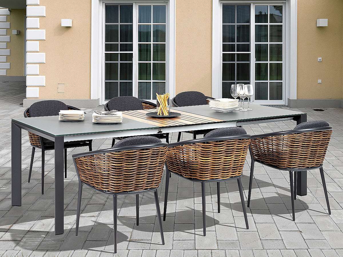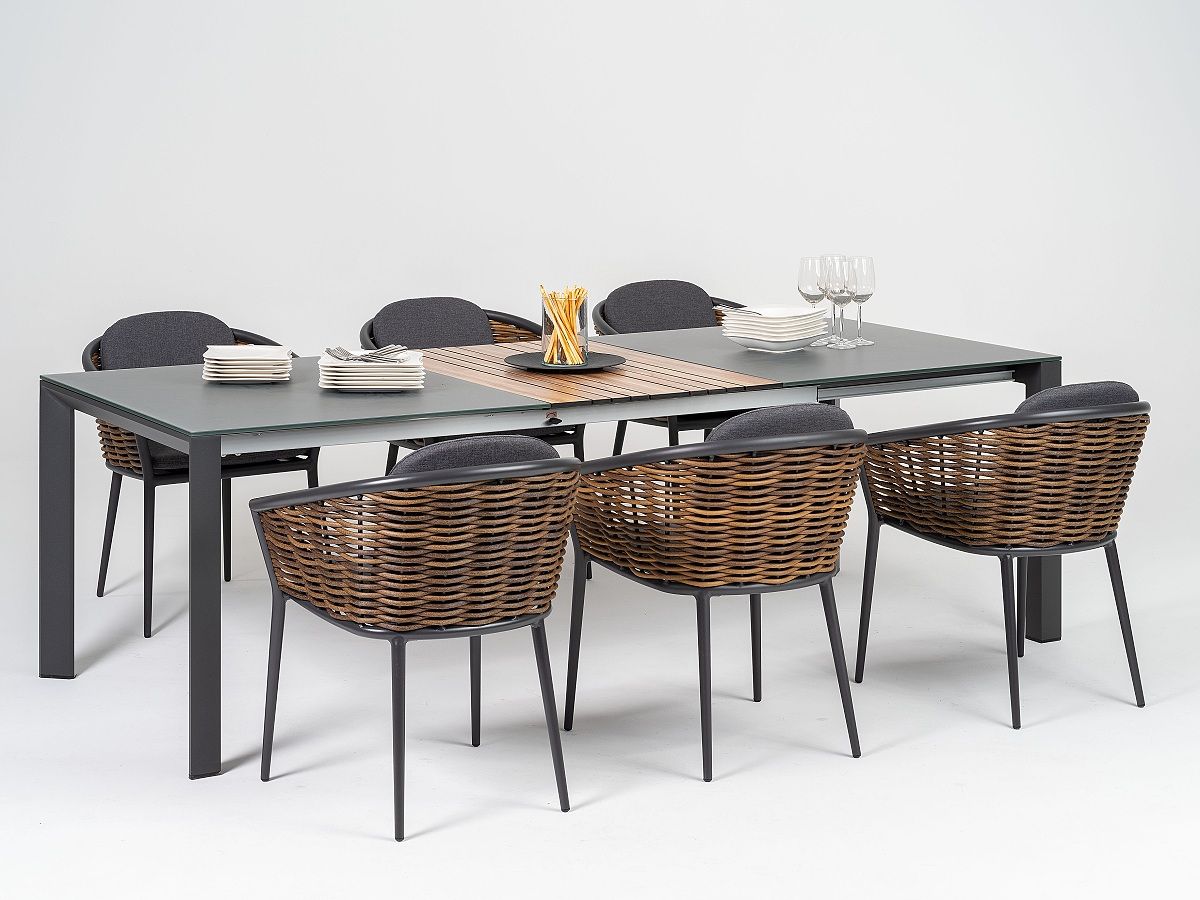 Nádherná stolová súprava Bounty Harmony bude dokonalým miestom na letné posedenia s priateľmi či rodinou. Vďaka rozťahovaciemu stolu môžete usporiadať záhradnú párty a všetkých hostí pohodlne usadíte. Stôl má hliníkový rám v antracitovej farbe a stolová doska je z tvrdeného skla v matnej antracitovej farbe a výsuvná doska je z HPL v teakovom vzhľade. Stolička Bounty má hliníkový rám v antracitovej farbe a výplet stoličky je z hrubého dutého ratanu v hnedej naturálnej farbe. Stolička Bounty je doplnená o pohodlný podsedák a opierkový vankúš.