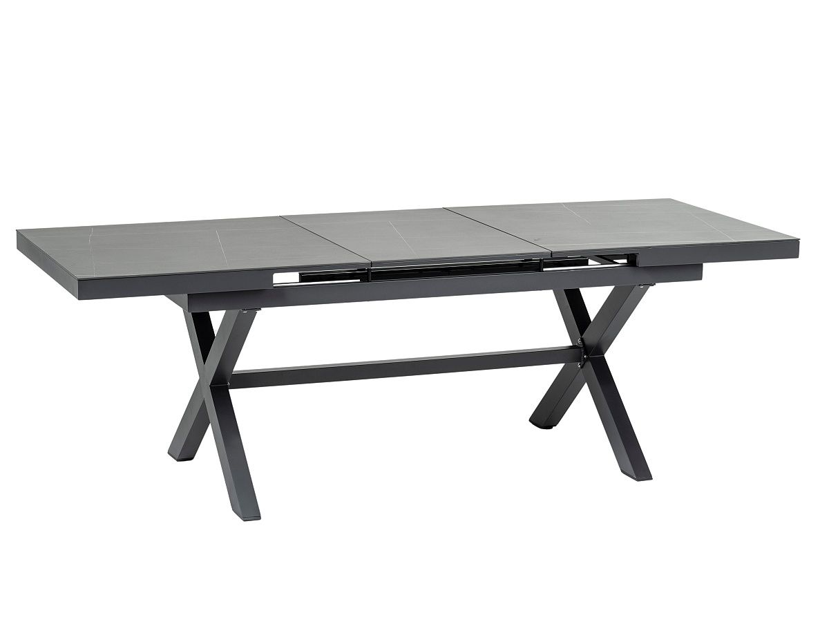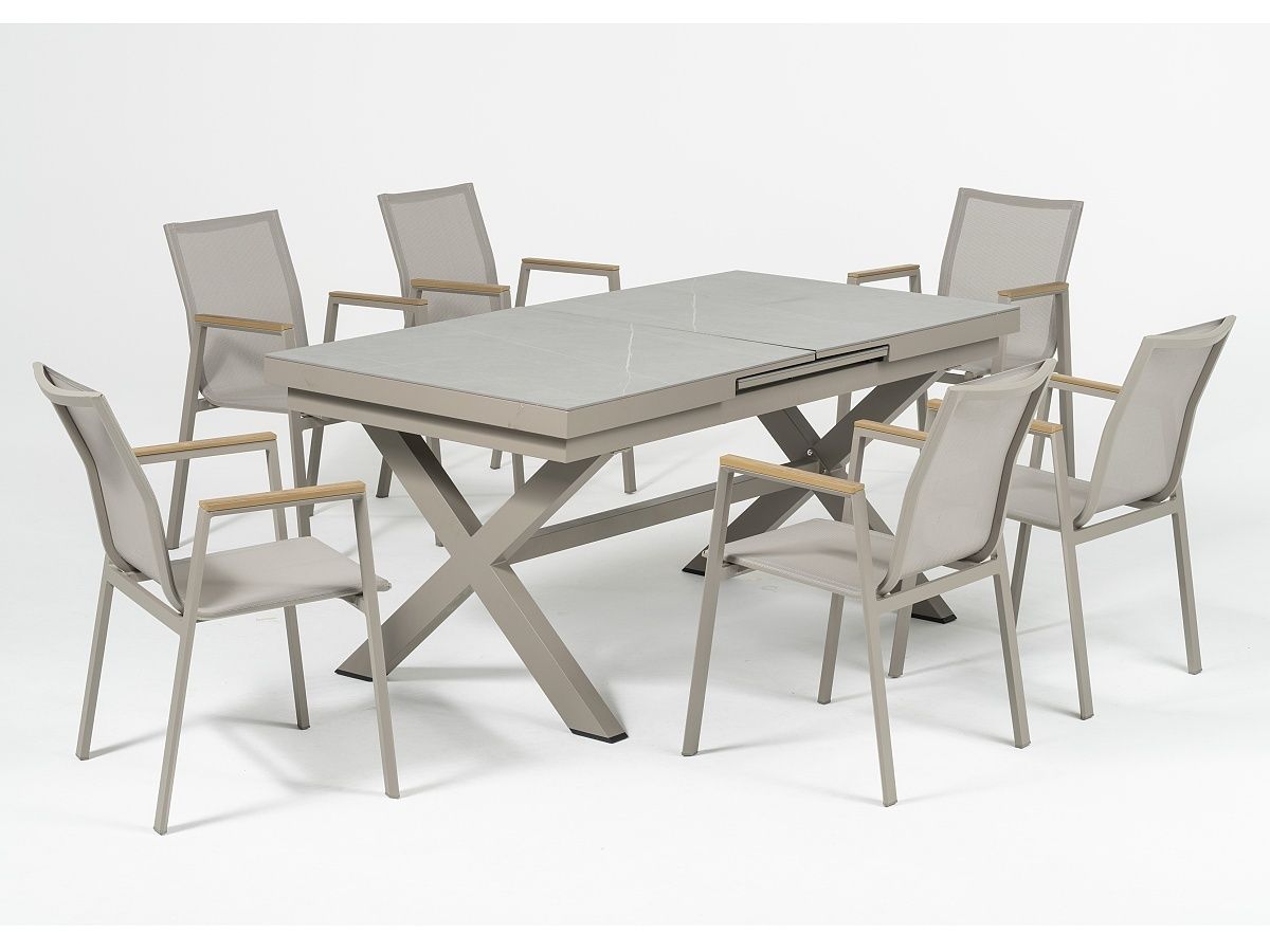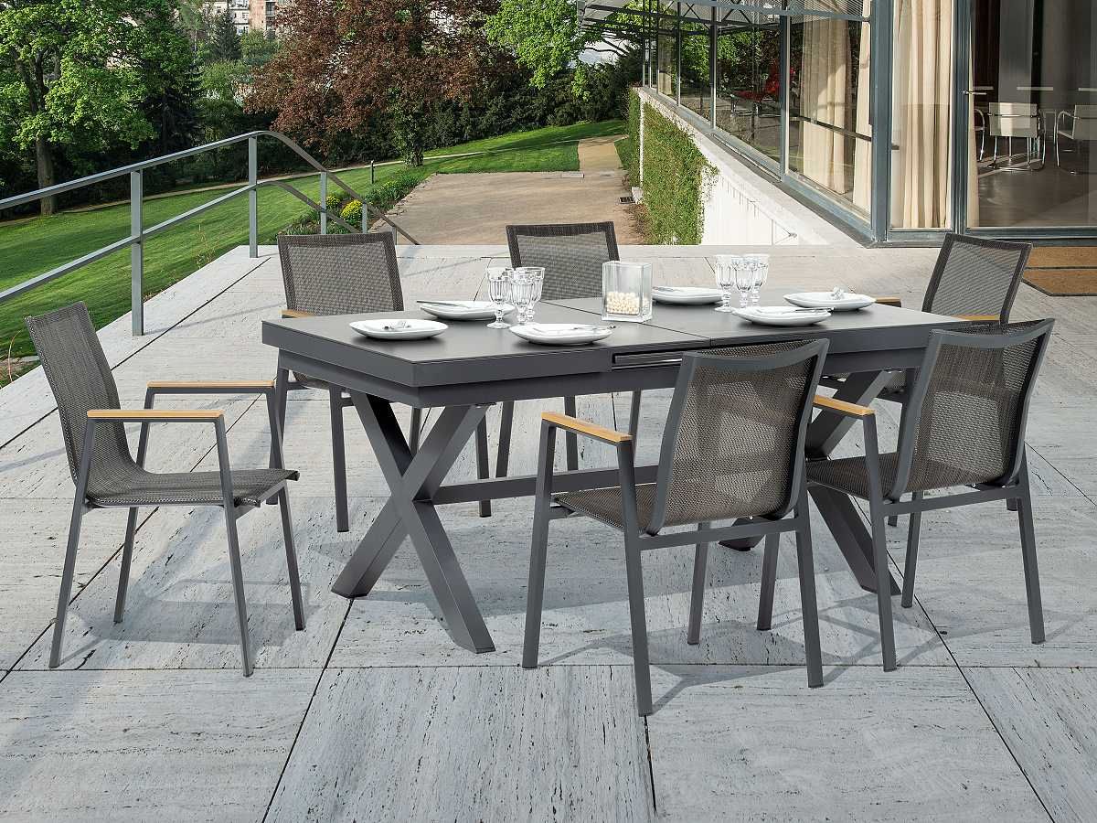 Elegantná a veľmi praktická jedálenská stolová súprava Comodo je ideálnou voľbou pre tých, ktorý sa nechcú moc starať o svoj záhradný nábytok. Stôl má hliníkový rám v champagne alebo antracitovej farbe a stolová doska je z vysoko odolného materiálu sinterstone. Pri prevedení s rámom champagne je stolová doska v svetlosivom mramorovom vzhľade. Pri prevedení s antracitovým rámom je stolová doska v čiernom mramorovom vzhľade. Stôl sa dá jednoducho roztiahnuť pomocou synchrónného automatického vysúvania. Stoličky majú hliníkový rám v rovnakom farebnom prevedení ako stoly - champagne alebo antracit. Stoličky sú potiahnuté pevným rýchloschnúcim textilénom. Opierky na stoličkách majú polywoodové latovanie v imitácii teakového dreva. Obe prevedenie môžete vidieť v priložených obrázkoch v galérii.