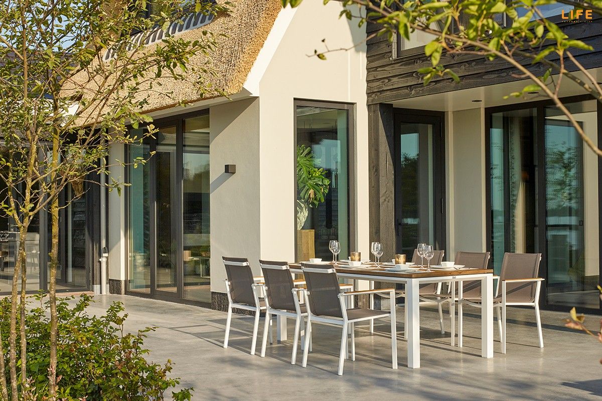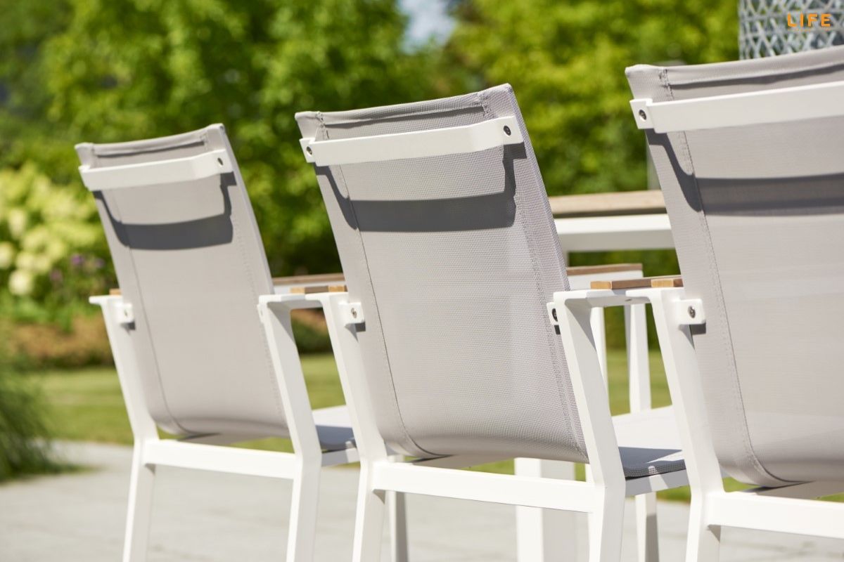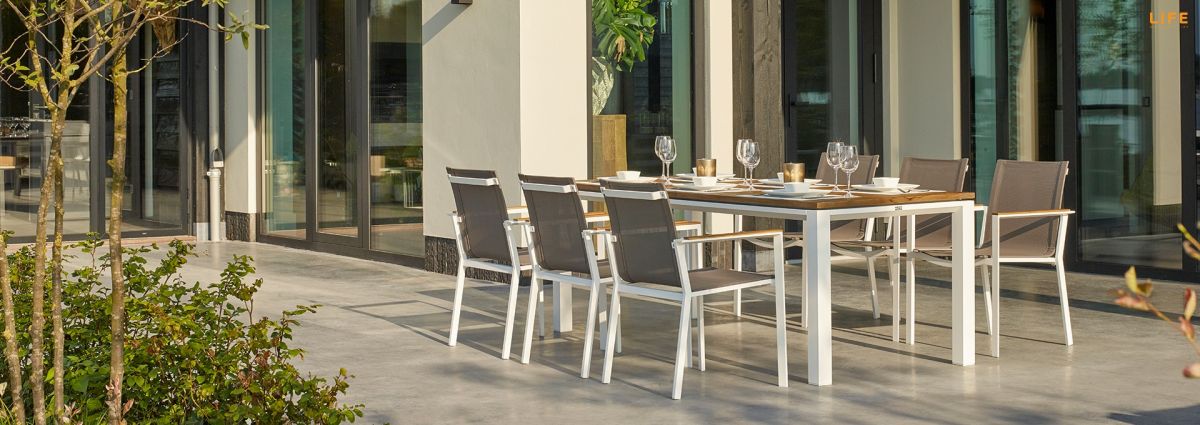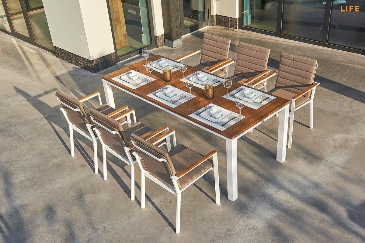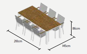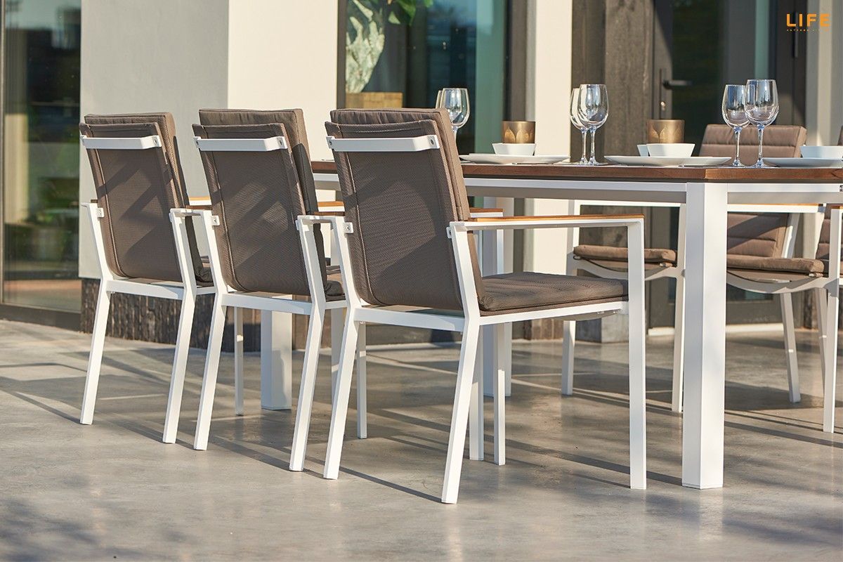 Dokonalá záhradná stolová súprava Concept Teak Primavera zkrášli aj Vašu terasu. Stôl Concept má konštrukciu z pevného hliníkového rámu. Stolová doska je z teakového dreva najvyššej kvality z certifikovaných indonézských plantáží. Pri dĺžke 210 cm si pohodlne vychutnáte nedeľný obed v kruhu rodiny na Vašej terase či v altánku. Stolička má hliníkovú konštrukciu, sedacia časť je z rýchloschnúceho textilénu, ktorý je doplnený o pohodlný polster vhodný do akéhokoľvek počasia. Ten pokrýva nielen sedaciu, ale aj chrbtovú časť. Podrúčky na stoličke sú z teakového dreva a dodávaju pociť tepla, ked si o ne opriete ruky aj v chladnejších jesenných dňoch. Priestorovú dispozíciu môžete vidieť na priloženom obrázku.