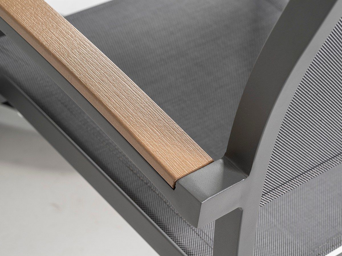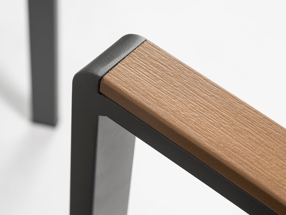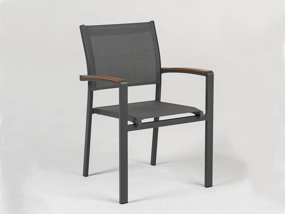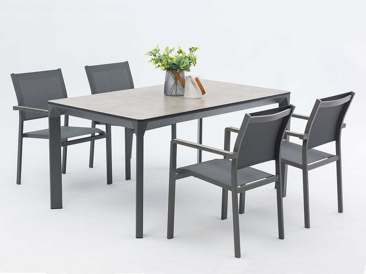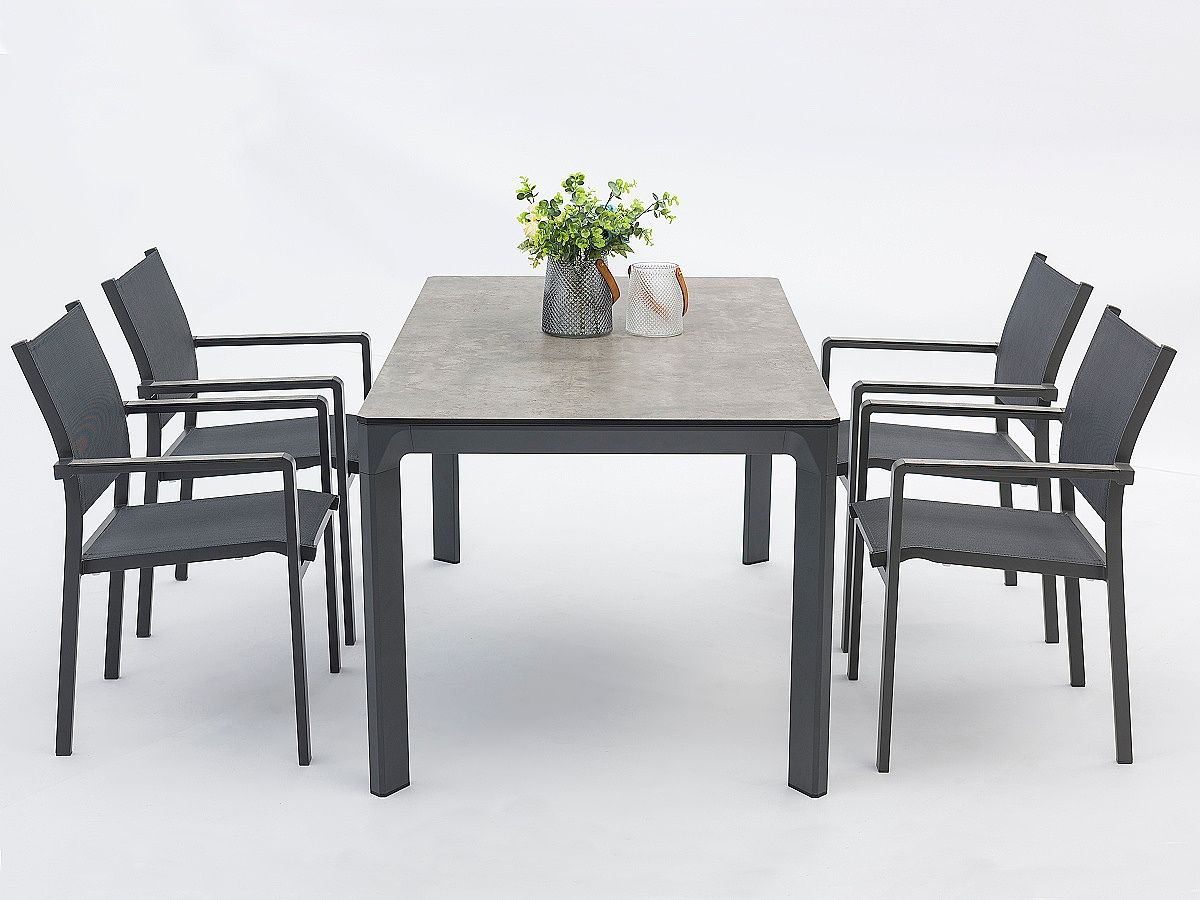 Elegantný a praktický typ záhradnej stolovej súpravy, ktorá Vám vydrží roky. Stôl Lilly má hliníkový rám v antracitovej farbe a stolová doska je z materiálu HPL o hrúbke 12mm v sivej kamennej farbe. Stolička má hliníkovú konštrukciu a je potiahnutá rýchloschnúcim textilénom. Podrúčky stoličky sú z polywoodu v imitácii dreva. Tento typ stolovej súpravy môžete mať celoročne vonku bez nutnosti schovávania či prikrívania ochrannou plachtou.