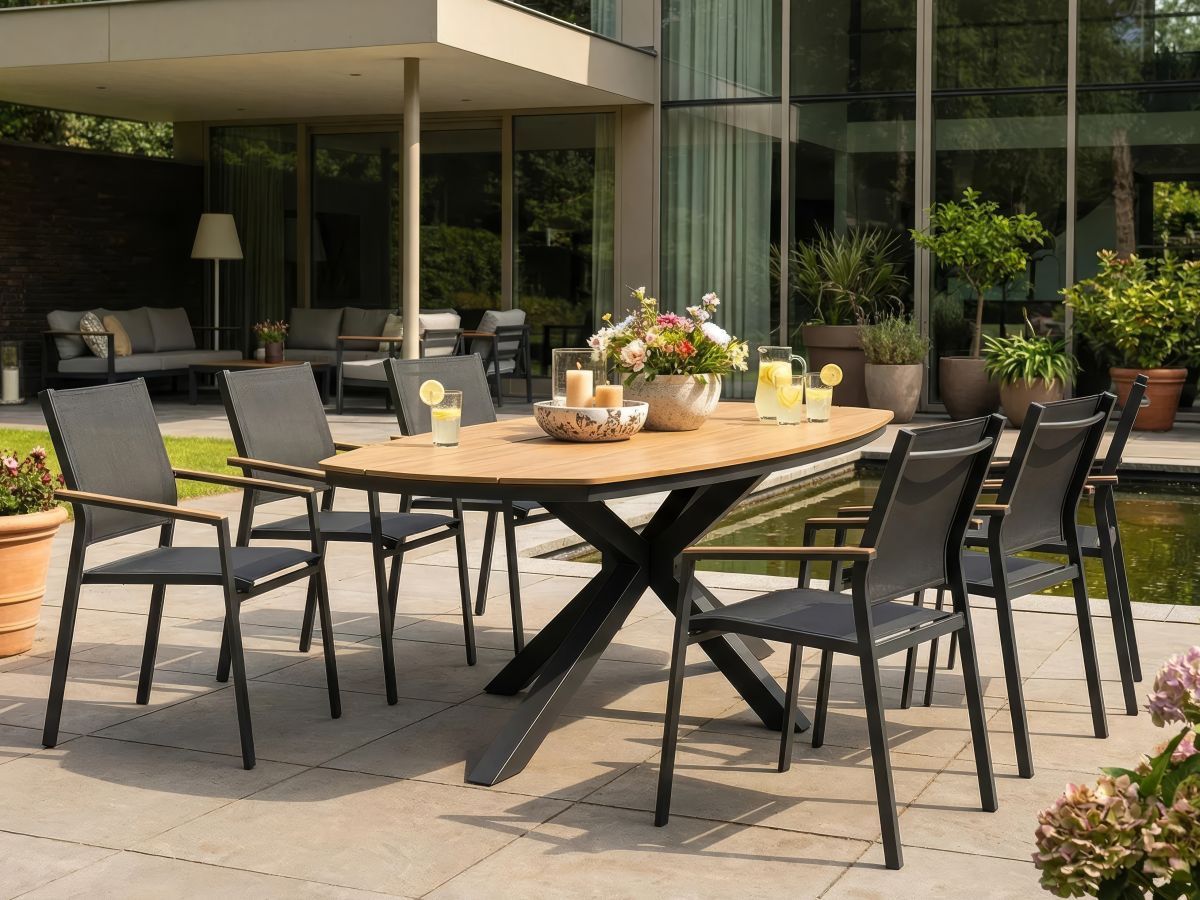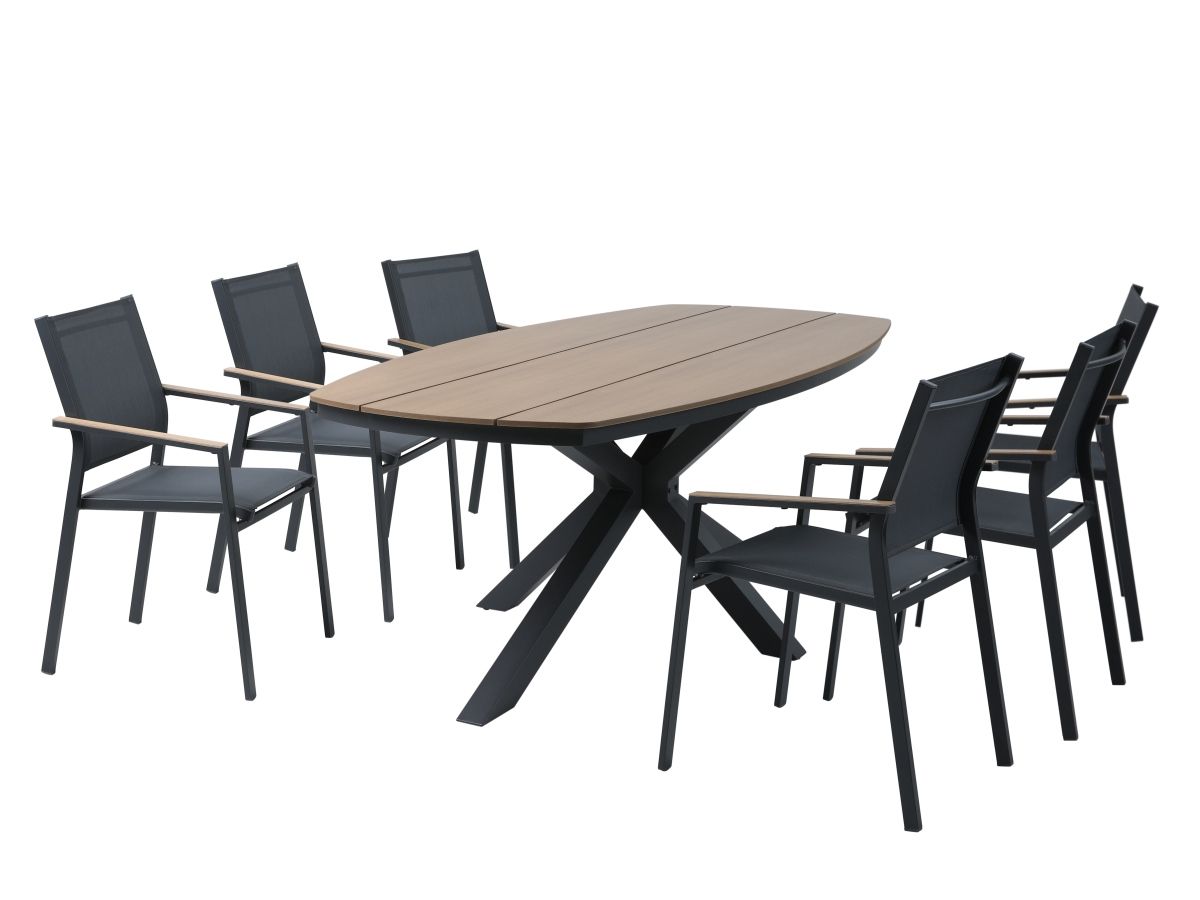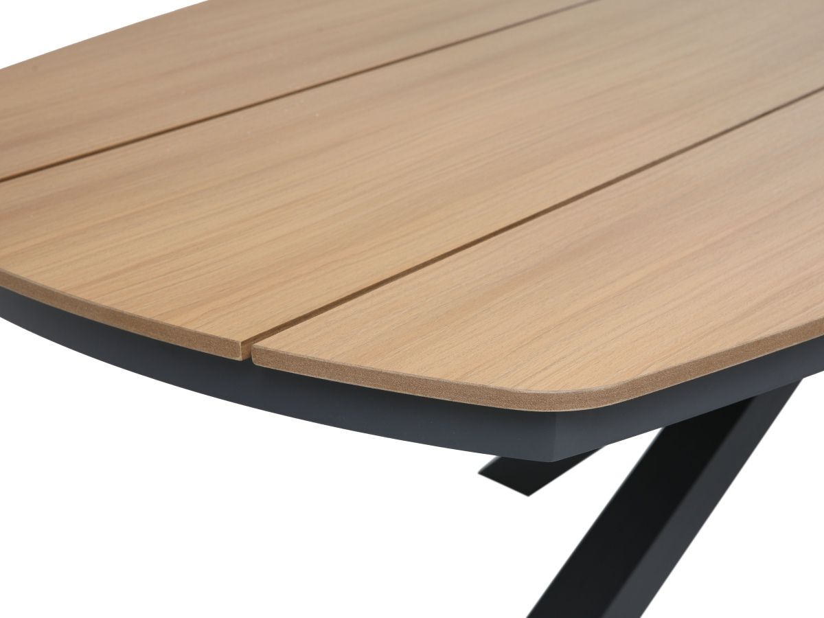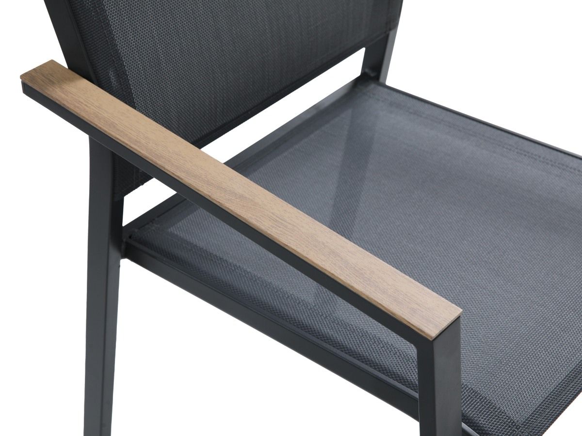 Stolová súprava Lucca je ideálnou voľbou pre tých, ktorí hľadajú spojenie moderného priemyselného dizajnu a hrejivých prírodných tónov. Vďaka antracitovej hliníkovej konštrukcii a kontrastným prvkom v drevenom dekore pôsobí súprava v priestore veľmi štýlovo a nadčasovo. Praktické prevedenie sedacej časti z odolného textilu a bezúdržbová doska stola z materiálu Polywood zabezpečujú, že súprava vyžaduje minimálnu starostlivosť pri zachovaní maximálneho vizuálneho efektu a komfortu pri stolovaní.