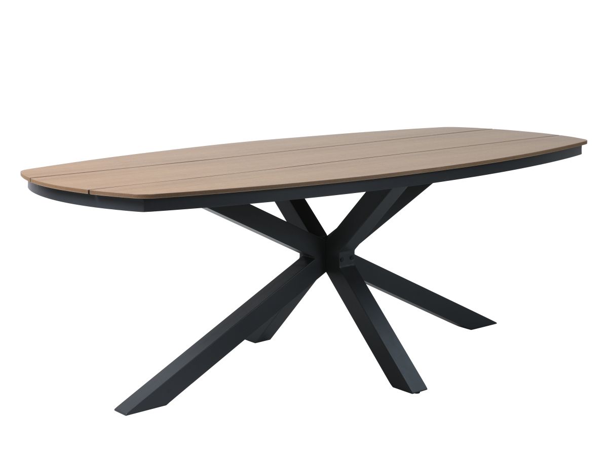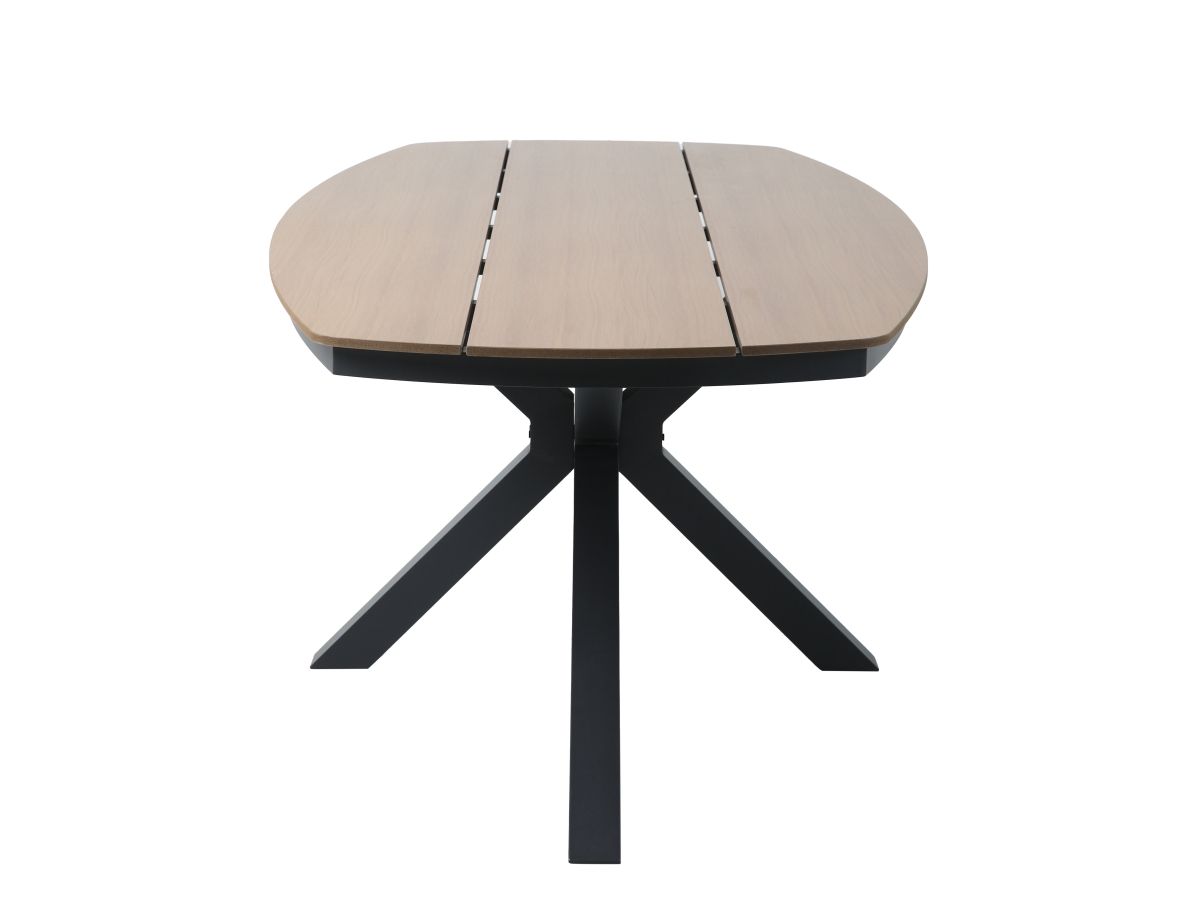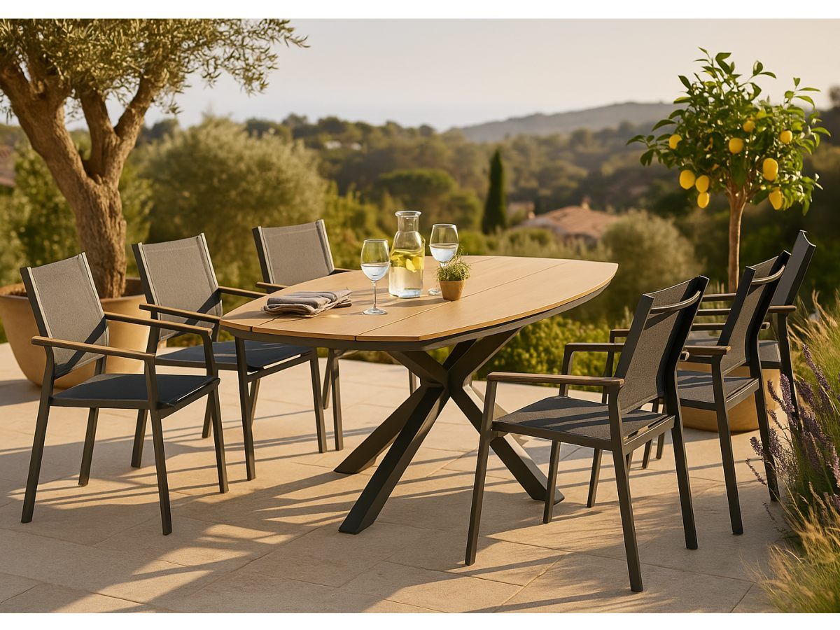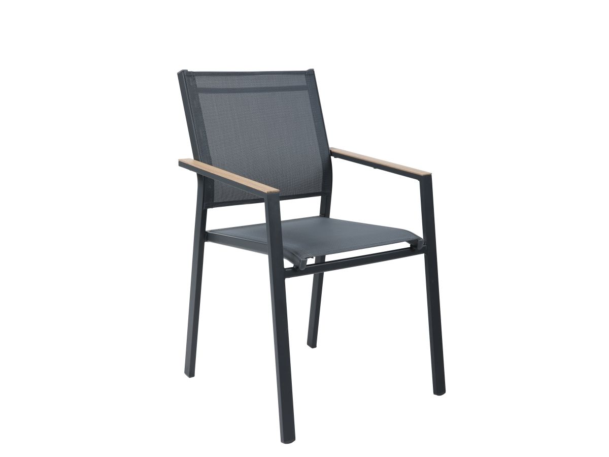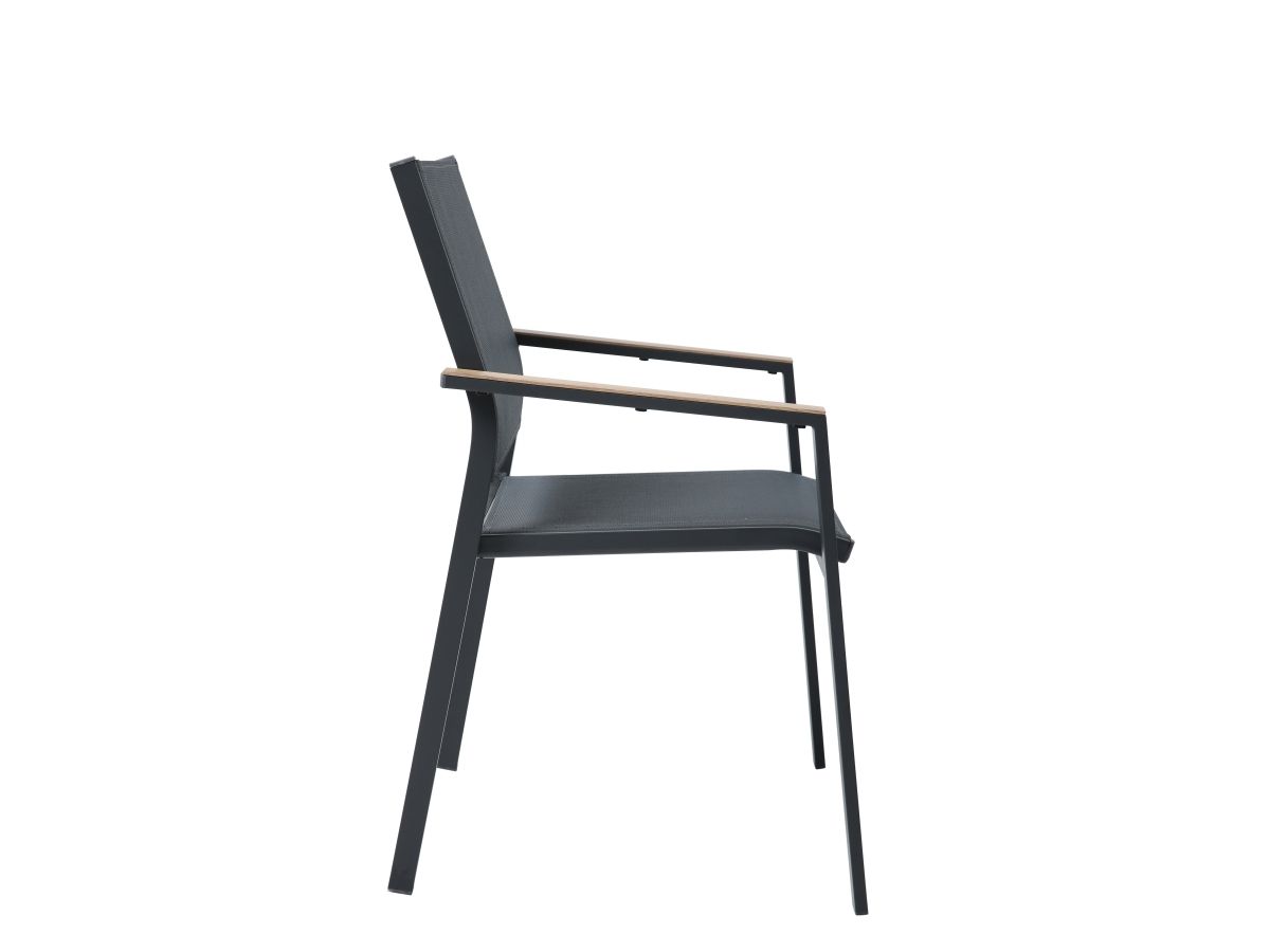 Stolová súprava Lucca je ideálnou voľbou pre tých, ktorí hľadajú spojenie moderného priemyselného dizajnu a hrejivých prírodných tónov. Vďaka antracitovej hliníkovej konštrukcii a kontrastným prvkom v drevenom dekore pôsobí súprava v priestore veľmi štýlovo a nadčasovo. Praktické prevedenie sedacej časti z odolného textilu a bezúdržbová doska stola z materiálu Polywood zabezpečujú, že súprava vyžaduje minimálnu starostlivosť pri zachovaní maximálneho vizuálneho efektu a komfortu pri stolovaní.