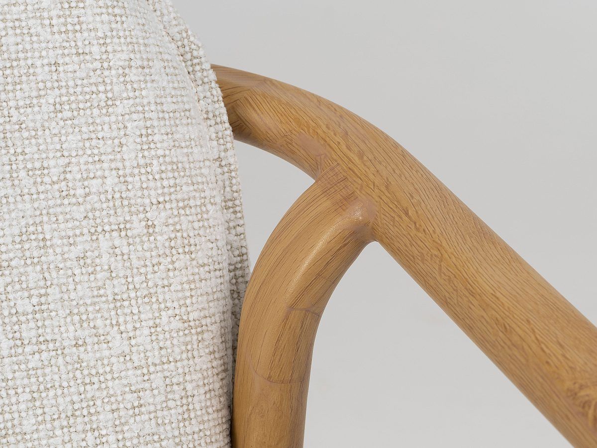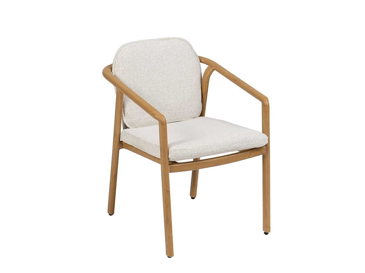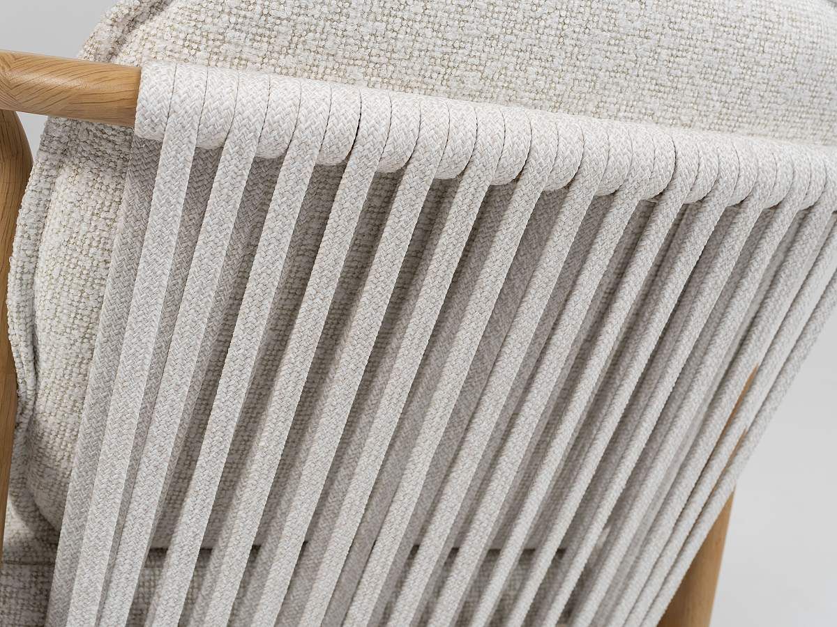 Kreslá: Ergonomická konštrukcia v dekore dreva so zaoblenými podrúčkami. Operadlo tvorí elegantný vertikálny výplet z hrubých šnúr v svetlosivej farbe. Komfort dopĺňajú outdoorové vankúše v melírovanom prevedení.