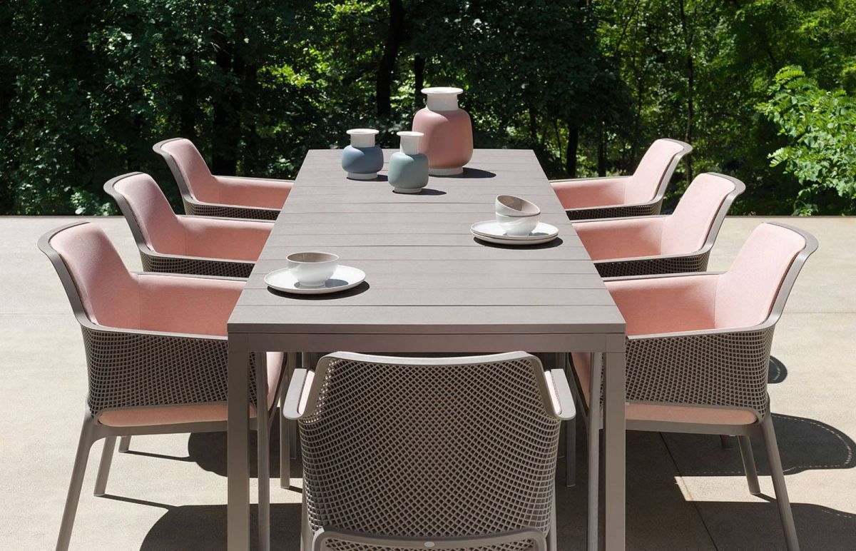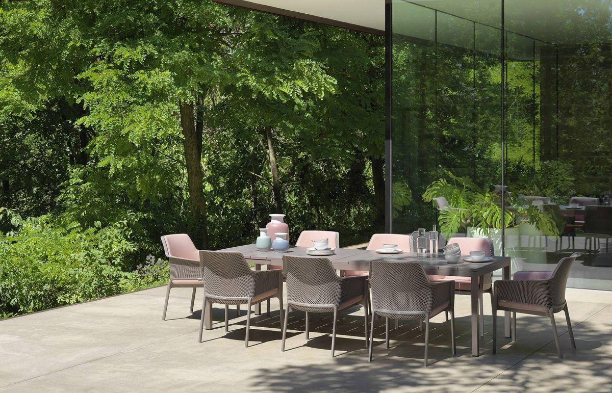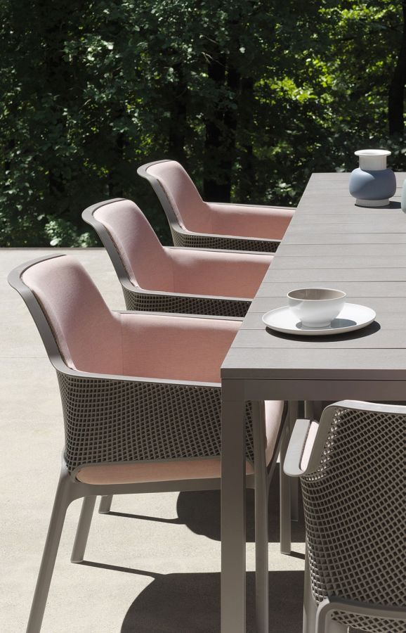 Pri záhradnej stolovej súprave Rio Net Relax Shell je doska stola z DurelTOP tvrdeného plastu a rám stola je z hliníka. Stôl má možnosť rozťahovania a to pomocou koľajnicového systému. Za pár sekúnd roztiahnete stôl z pôvodných 210 cm na 280 cm, takže ho dokonale využijete pri rodinných oslavách. Môžete si vybrať z 3 farebných prevedení. Stôl je dostupný aj vo verzii s hliníkovou stolovou doskou a aj v menšom prevedení 140/210 cm. Kreslo Net Relax je vyrobené z tvrdeného plastu spevneného sklenným vláknom. Je dostupné v 6 farebných prevedeniach. Kreslo na obrázku obsahuje opierkovú výplň SHELL a pohodlný podsedák hrubý 8 cm, ktorý nielen plní funkciu väčšej pohodlnosti, ale aj kreslo vizuálne zvýrazní.
