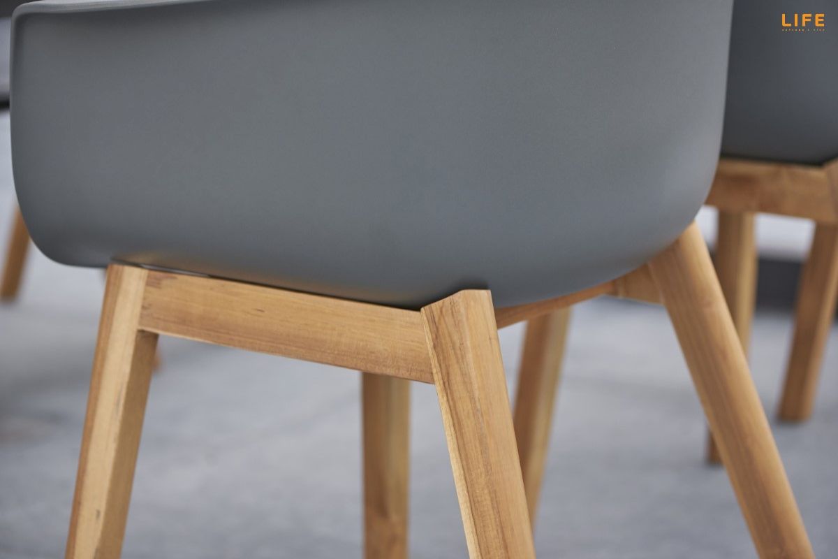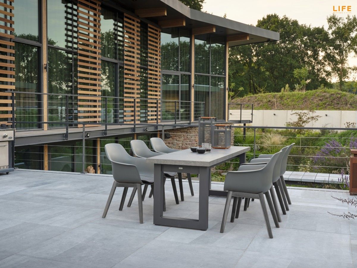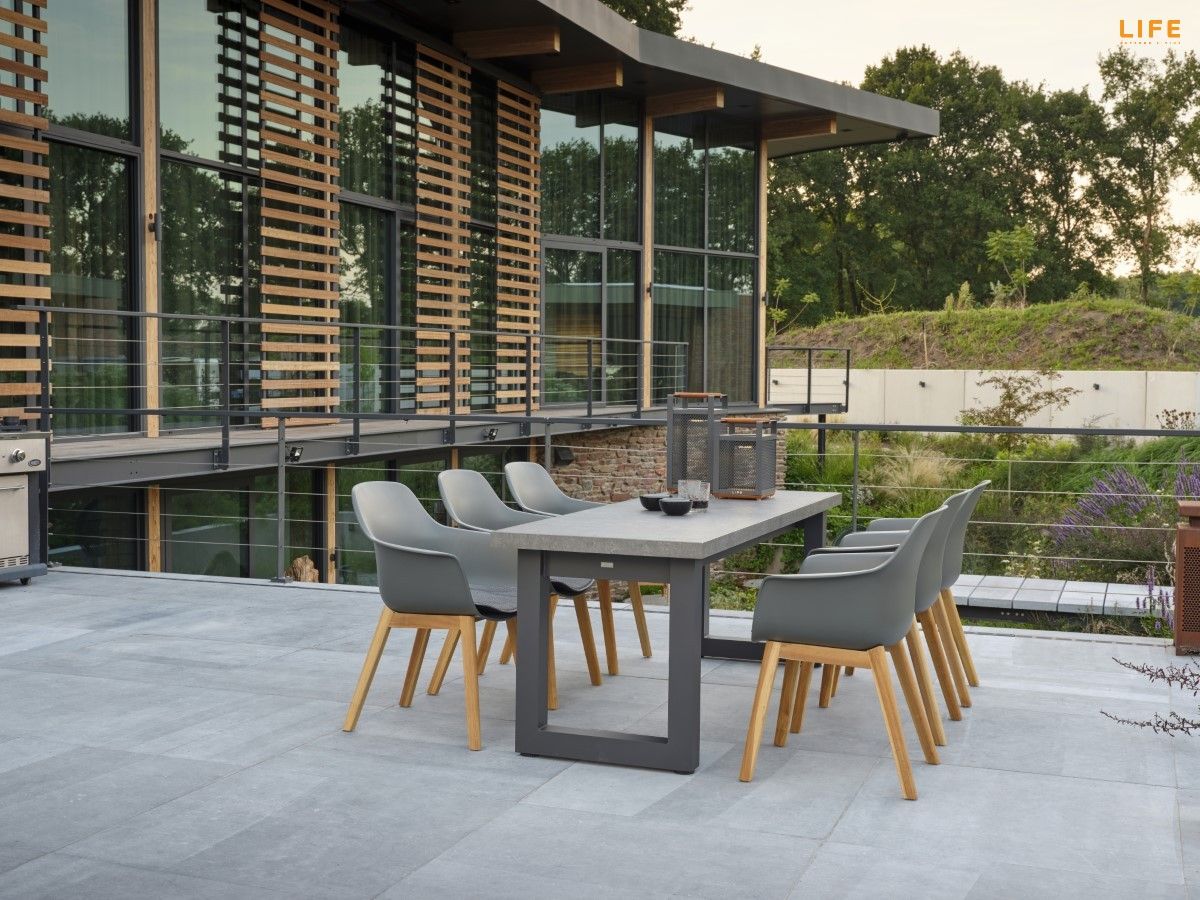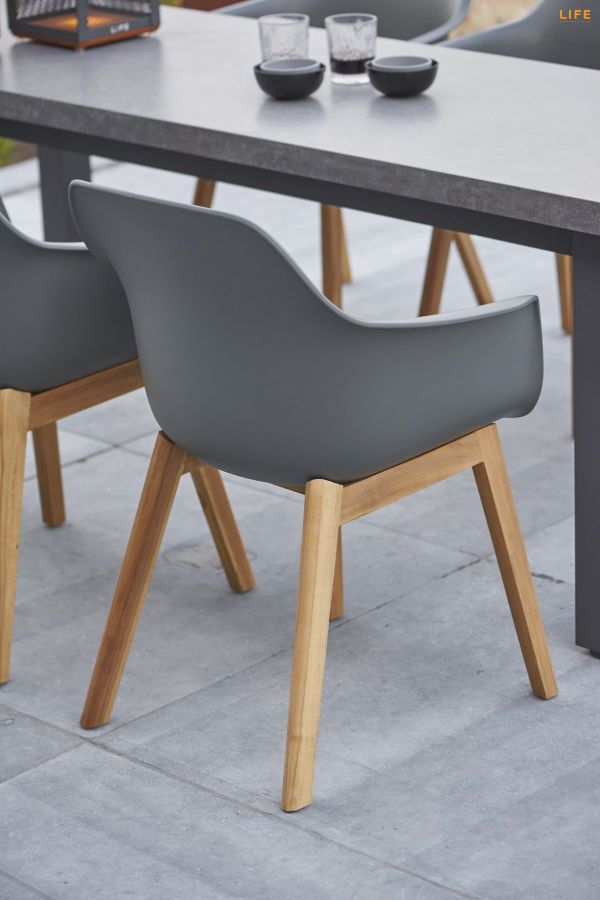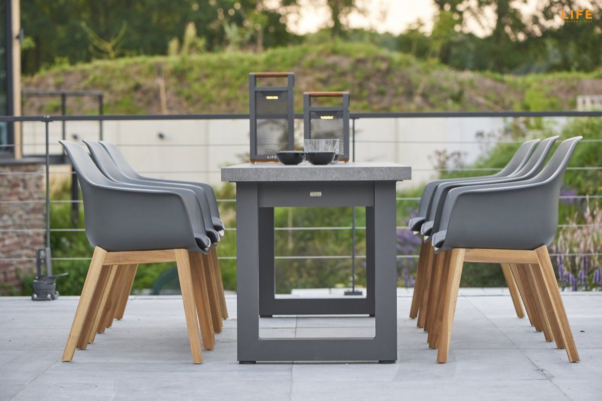 Pútavá stolová súprava Stelvio Denver black sa dokonale hodí do industriálneho štýlu terasy ale aj interiéru, kde sa spája betón, drevo a kov. Stôl Stelvio ma hliníkový rám a stolová doska je z Ceramic Concrete look (keramická stolová doska, ktorá imituje betón). Stolička má nohy z teakového dreva, sedacia časť je z polypropylénu doplnená pohodlným podsedákom. Stolička Denver je dostupná v bielej, čiernej a zelenej farebnej kombinácii.