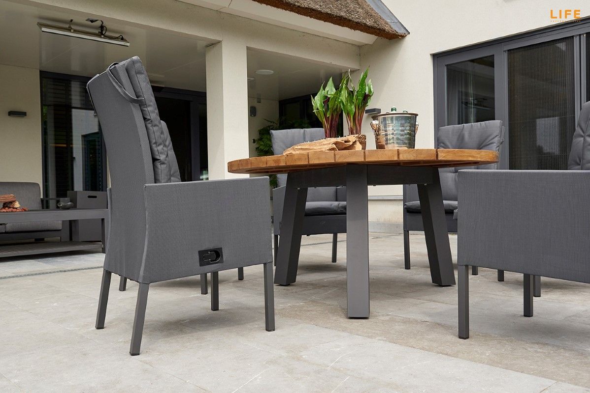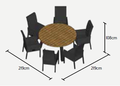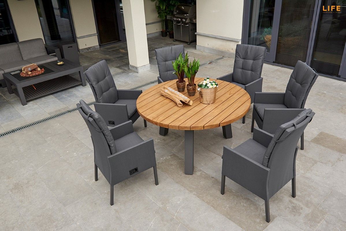 Nádherná a veľmi pohodlná záhradná stolová súprava Texas Caribean Lava je dokonalou voľbou pre ľudí, ktorí radi stolojú za okrúhlym stolom a vychutnávajú si tak bližší kontakt so všetkými priateľmi za stolom. Stôl má hliníkový rám a stolová doska je z masívneho teakové dreva z certifikovaných indonézskych plantáží. Kreslo Caribean je polohovateľné pomocou páčky na pravej vonkajšej strane. Kreslo môže byť vonku za každého počasia vďaka poťahom All Weather Cushions, takže Vás neprekvapí ani rýchly letný dážď. Pohodlné podsedáky len podčiarknu celkovú dokonalosť tohoto kresla. Priestorovú dispozíciu môžete vidieť na priloženom obrázku.