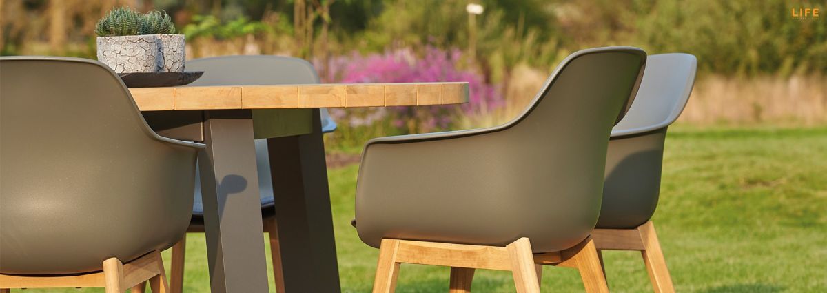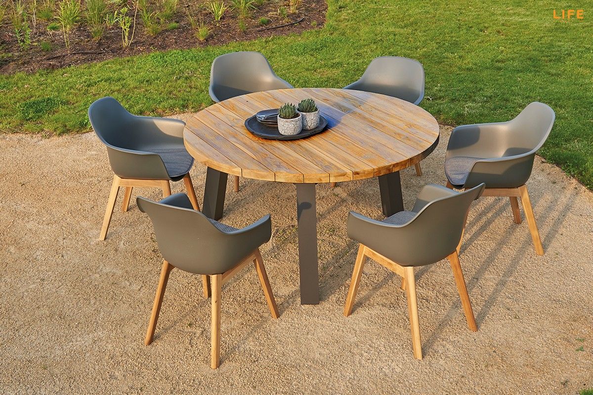 Nádherná záhradná stolová súprava Texas Denver lava je dokonalou voľbou pre ľudí, ktorí radi stolujú na terase za okrúhlym stolom. Stôl má hliníkový rám a okrúhla stolová doska je z masívneho teakové dreva z indonézskych certifikovaných plantáží. Stolička Denver lava je dostupná s drevennými alebo hliníkovými nohami. Telo stoličky je z polypropylénu dostupnej v bielej alebo tmavosivej farbe a je doplnená o pohodlný podsedák.
