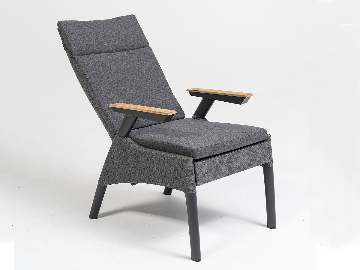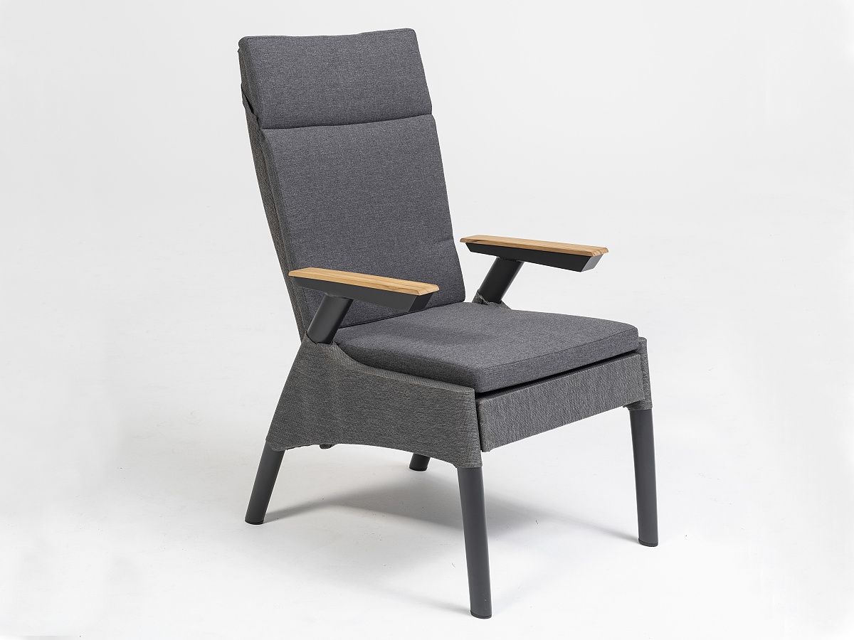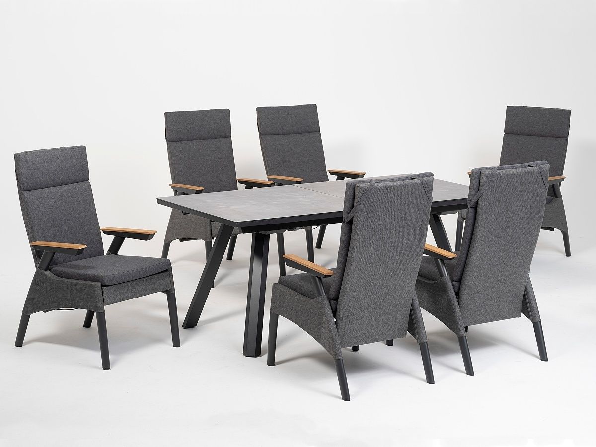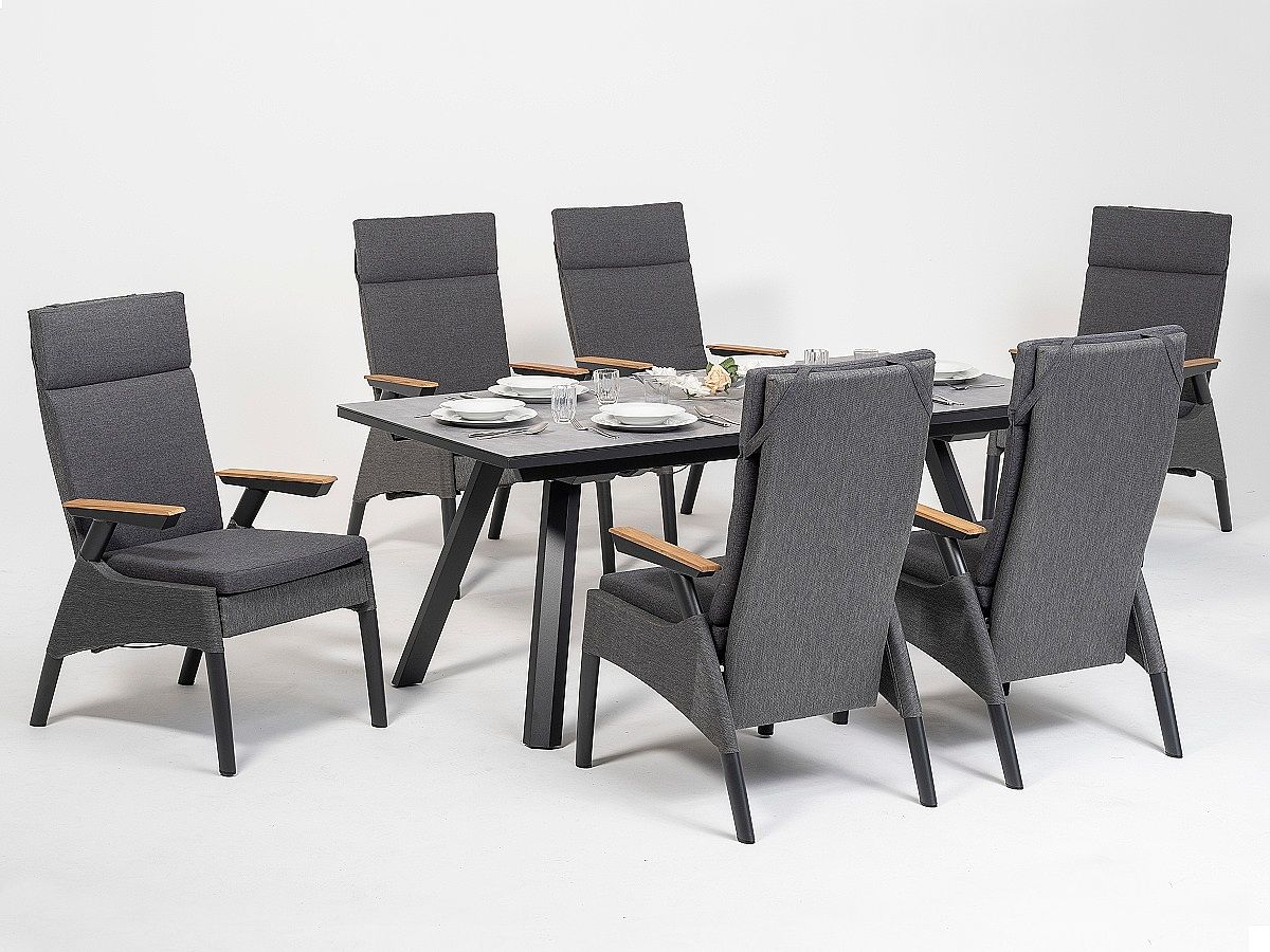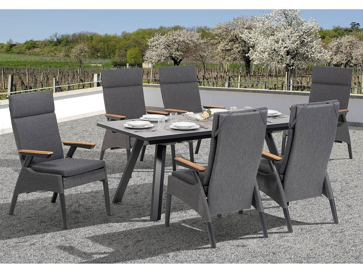 Elegantná a moderná jedálenská stolová súprava Thassos je ideálnou voľbou na terasy moderných domov. Stôl má hliníkový rám v antracitovej farbe a stolová doska je z tvrdeného skla s keramickým nástrekom s kamenným efektom. Stôl je rozkladací až do dvoch rôznych polôh, takže pohodlne usadíte k nemu celú rodinu. Kreslá Thassos majú tiež hliníkový rám s textilným poťahom, ktorý pôsobí veĺmi elegantna a je zároven pohodlný. Kreslo sa dá jednoducho polohovať vďaka tlačidlu na boku opierky. Vďaka vysokému operadlu bude kreslo veľmi pohodlné aj pre vysokých ľudí.
