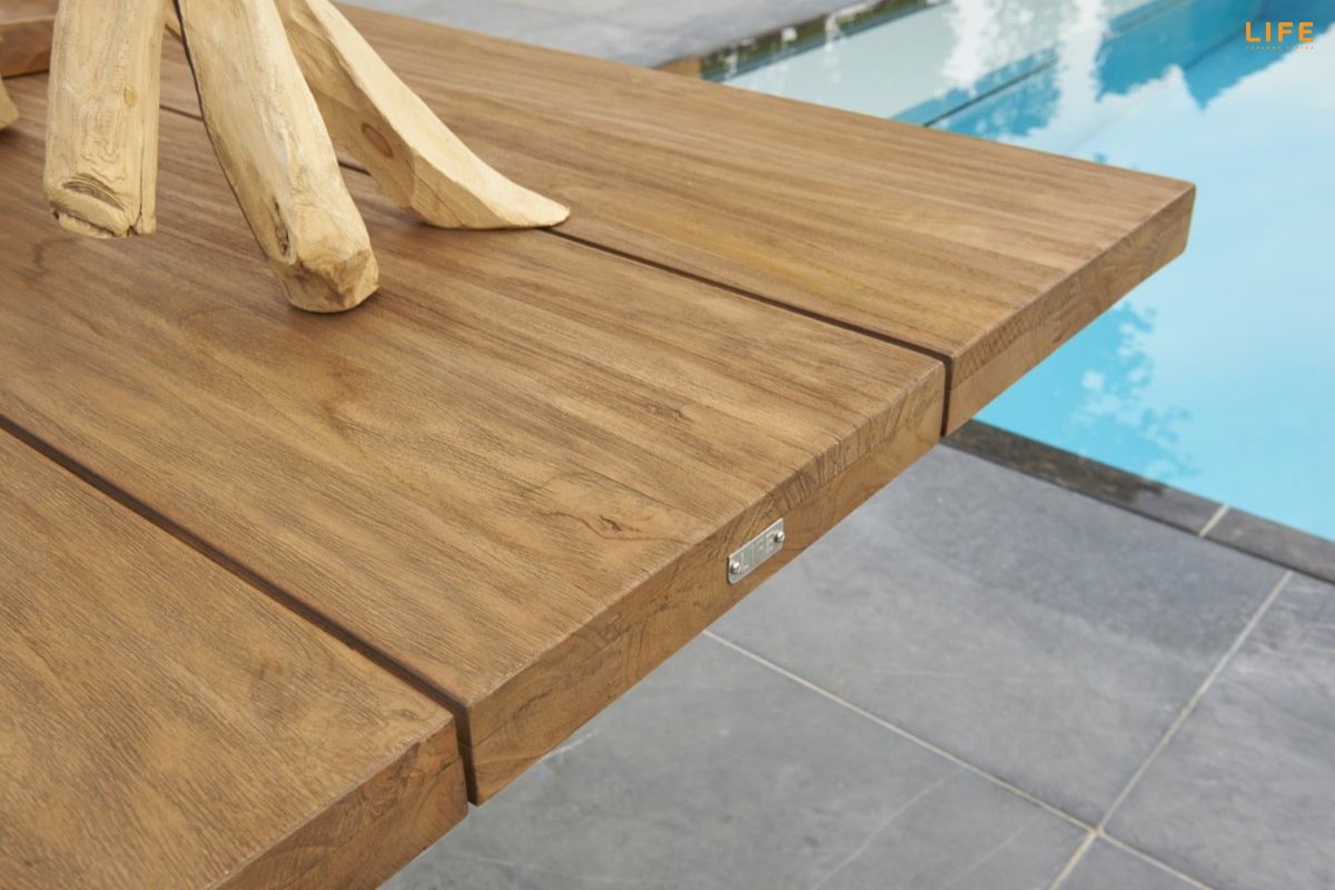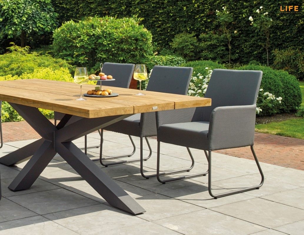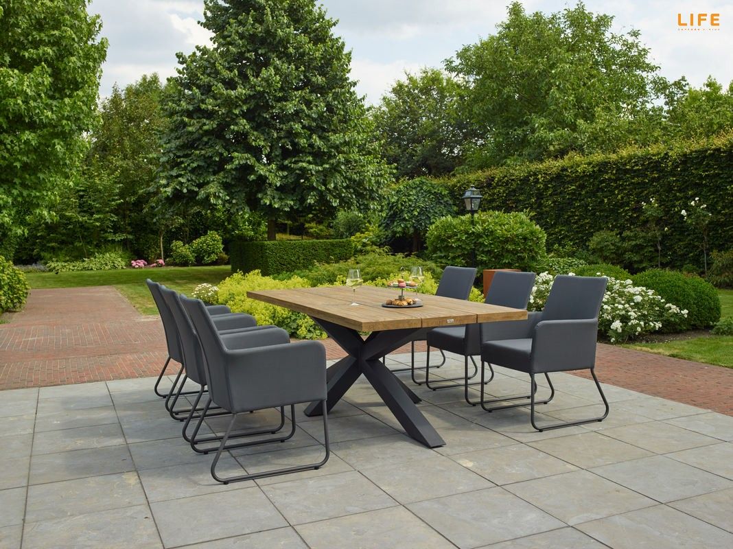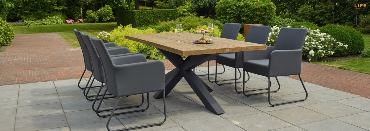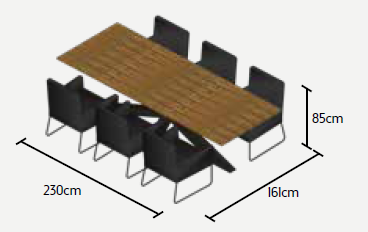 Exkluzívna jedálenská stolová súprava Timor Blixum so silným hliníkovým rámom s krížovou základňou a nádhernou robustnou teakovou stolovu doskou pôsobí luxusným dojmom na každej terase. Stolová doska je vyrobená zo 100% indonézskeho certifikovaného teakové dreva. Kreslo Blixum má hliníkovú konštrukciu a poťah z All Weather Cushions látky, takže je odolné voči všetkým typom počasia. Prostorovú dispozíciu súpravy vidíte na priloženom obrázku.