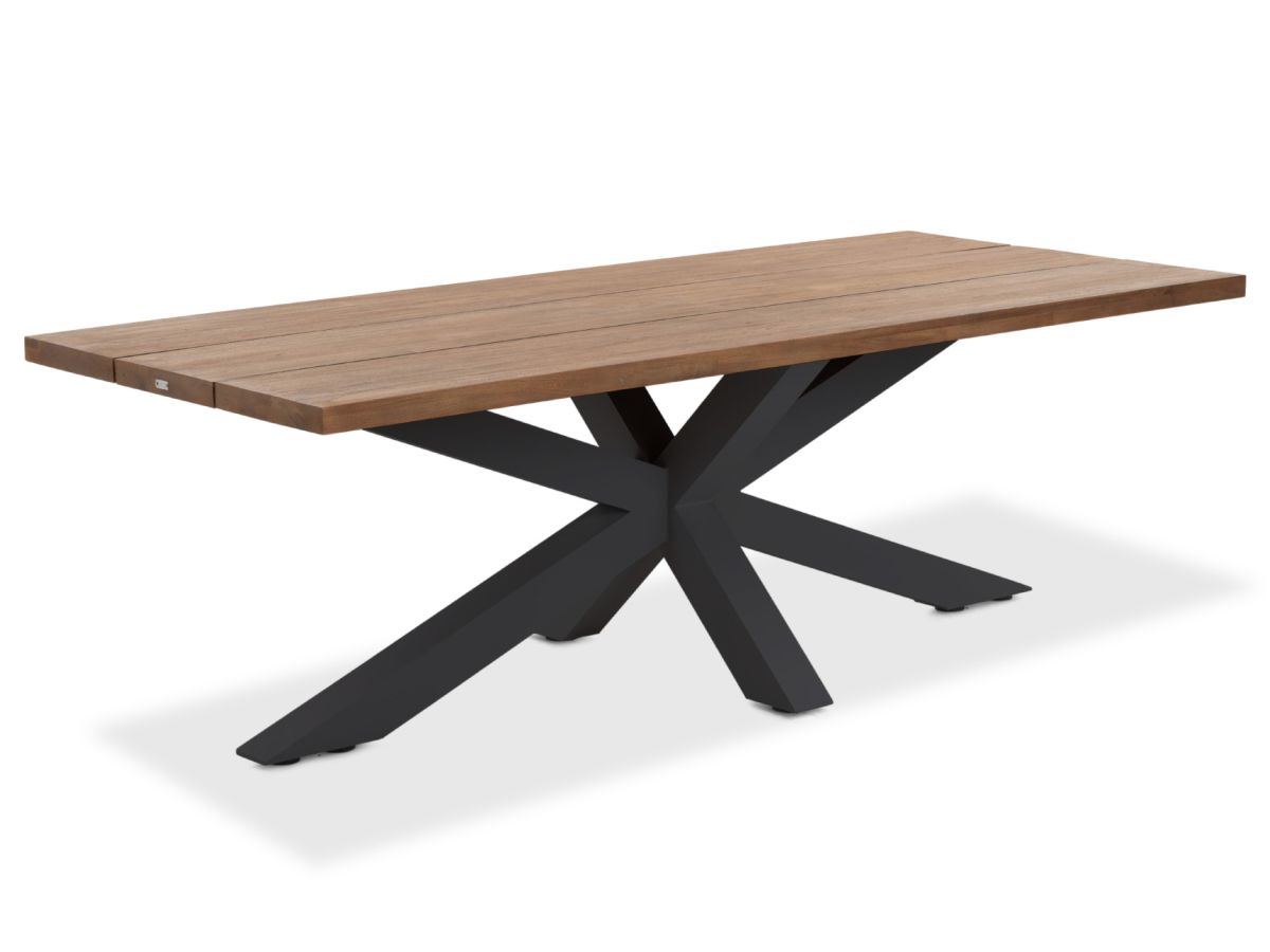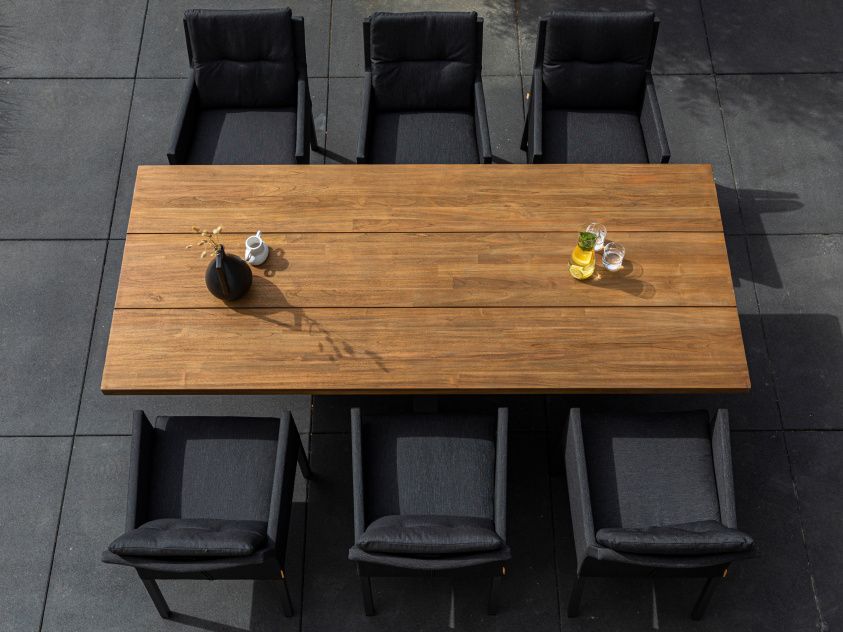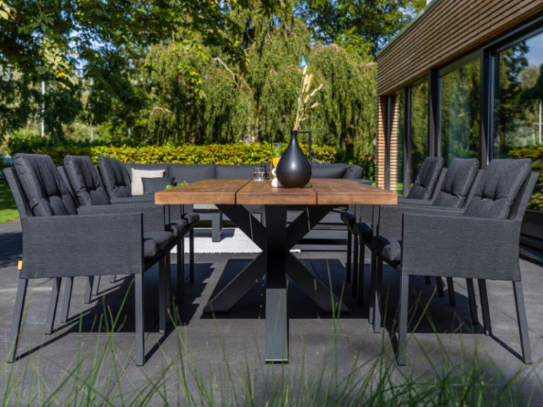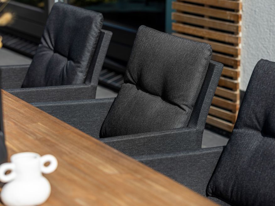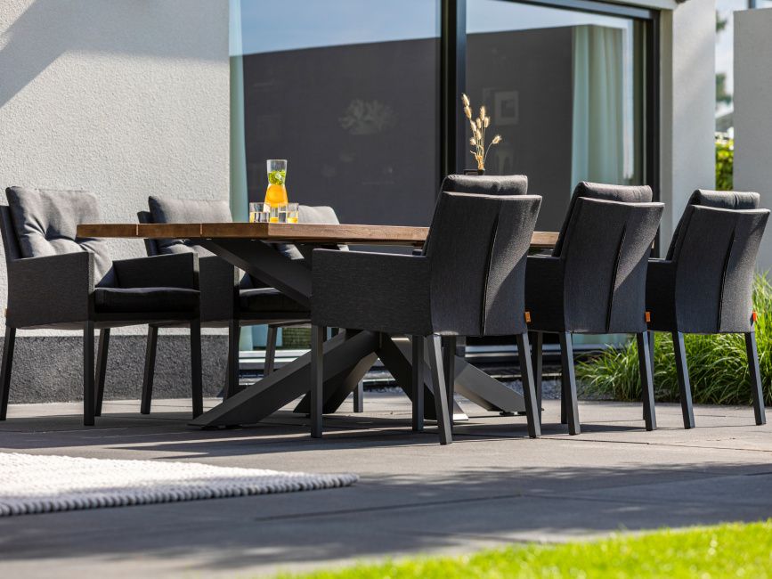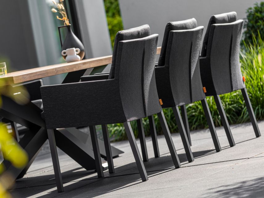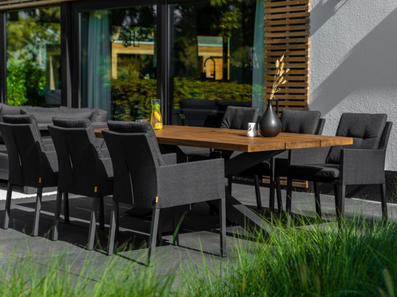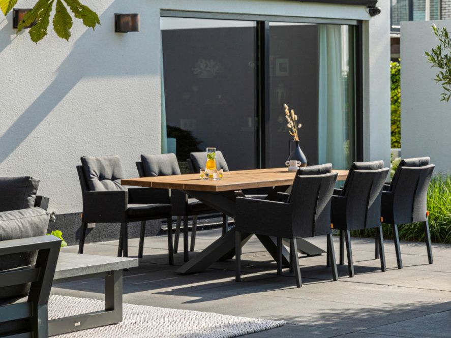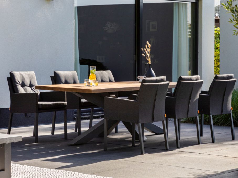 Exkluzívna jedálenská stolová súprava Timor Caribean Graphite so silným hliníkovým rámom s krížovou základňou a nádhernou robustnou teakovou stolovu doskou bude pôsobiť luxusným dojmom na každej terase. Stolová doska je vyrobená zo 100% certifikovaného premiového teakové dreva. Stolička Caribean má hliníkovú konštrukciu a poťah z látky Graphite SOLTEX takže je odolná voči všetkým typom počasia.