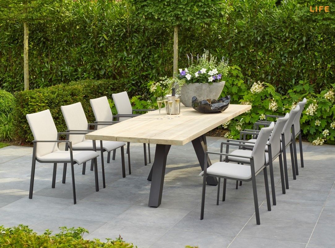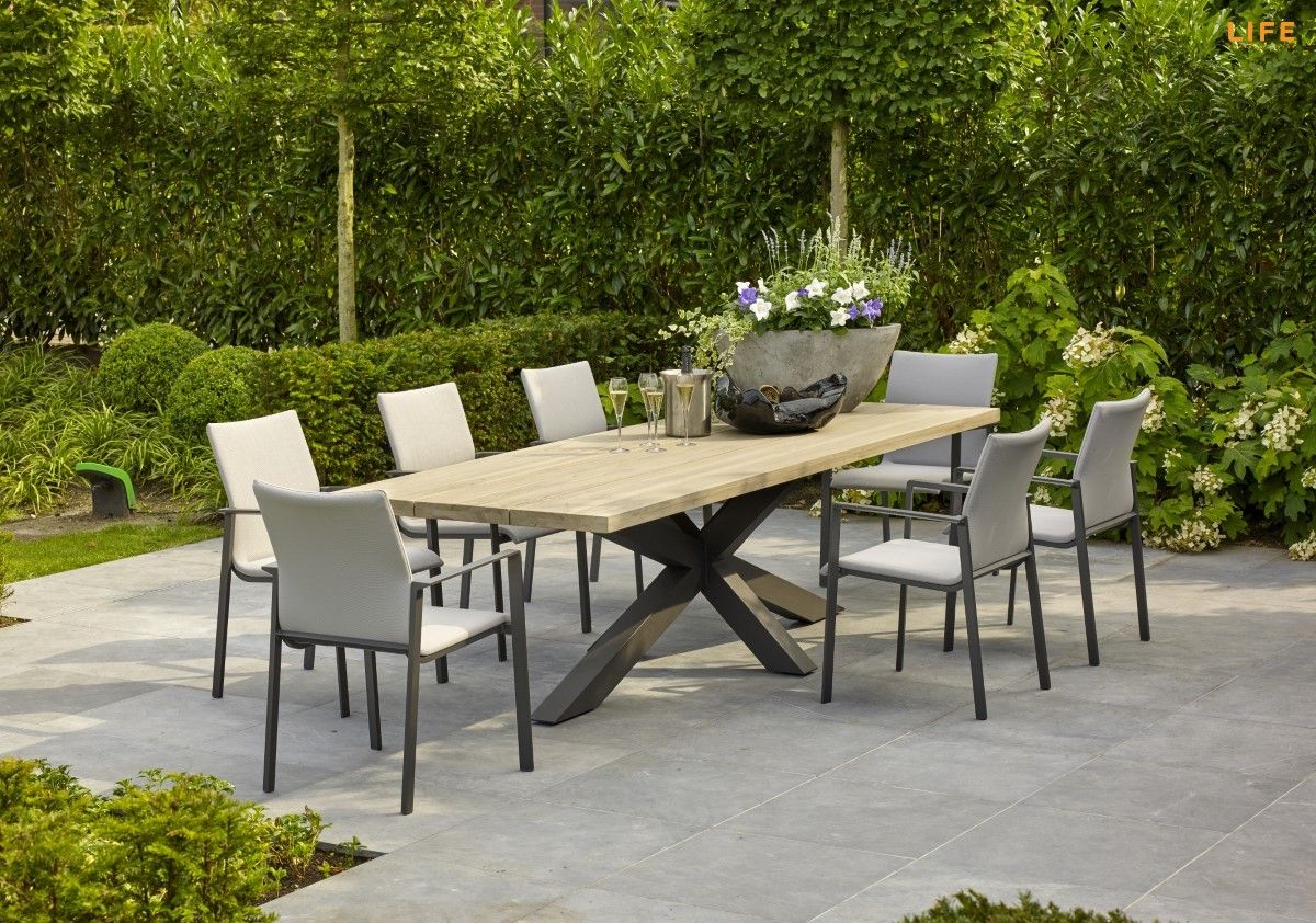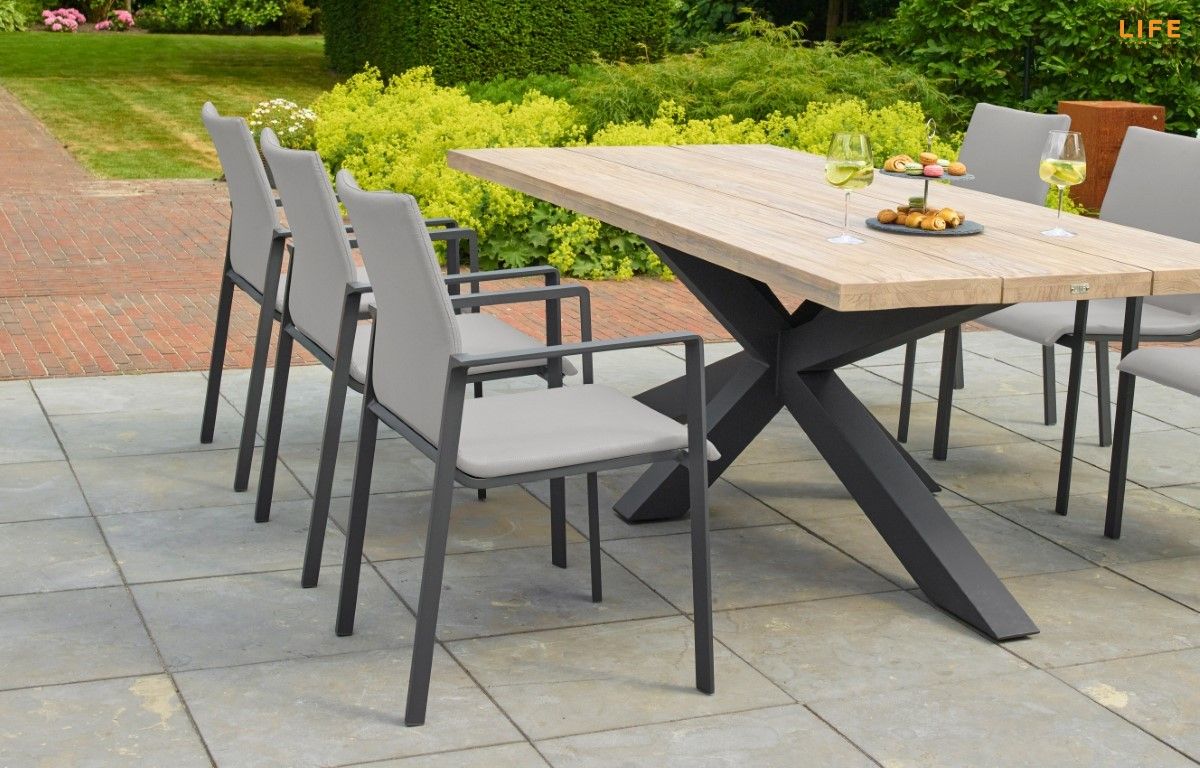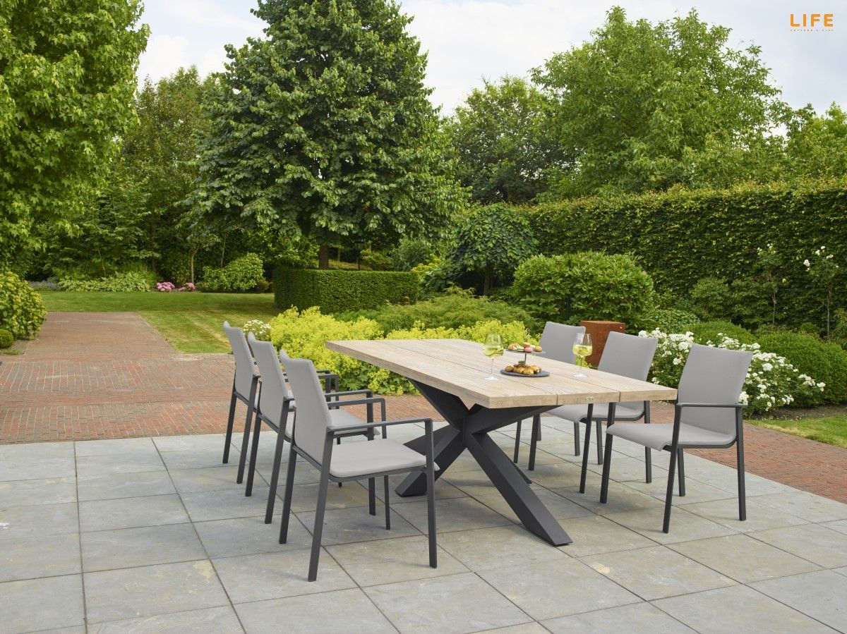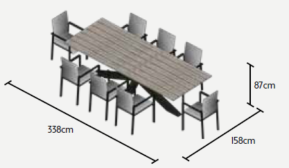 Záhradná stolová súprava Timor Sense lava mouse grey so silným hliníkovým rámom s krížovou základňou a robustnou sivou doskou z certifikovaného indonézskeho teakového dreva najvyššej kvality z udržateľných zdrojov. Pri sivej farbe teaku už nieje potreba stôl akokoľvek ošetrovat ako to býva zvykom pri hnedom prevedení. Stôl pôsobí veľmi luxusne a masívne, takže bude stredobodom pozornosti na každej terase či v záhradnej pergole. Stoličky majú hliníkový rám, sú veľmi pohodlné a sedacia časť je z poťahu All Weather Cushions, takže sa nemusíte obávať ani daždu. Priestorovú dispozíciu vidíte v priloženom obrázku.