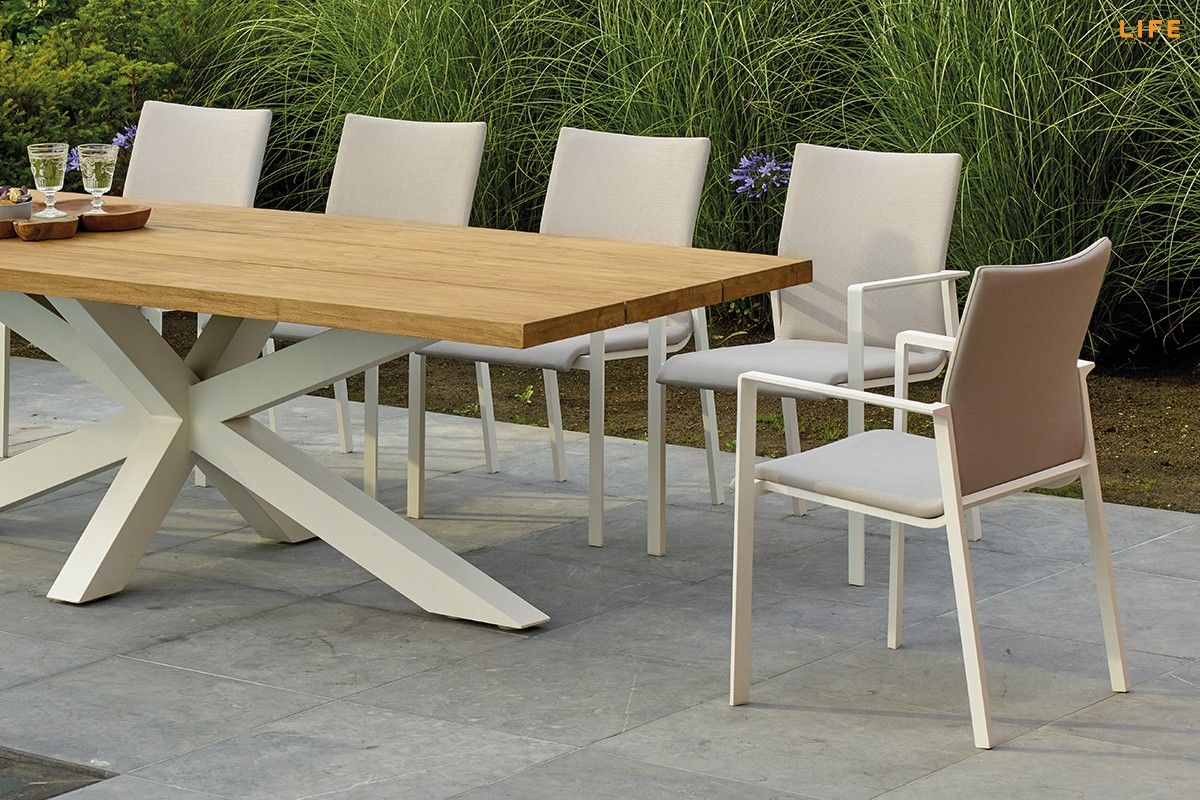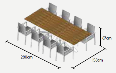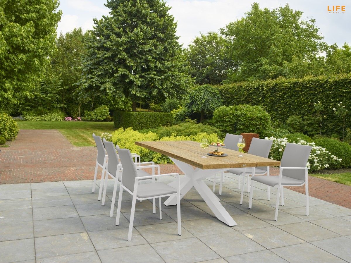 Záhradná stolová súprava Timor Sense white so silným hliníkovým rámom s krížovou základňou a robustnou hnedou doskou z certifikovaného indonézskeho teakového dreva najvyššej kvality z udržateľných zdrojov. Vďaka použitým materiálom môže byť táto luxusná stolová súprava celoročne vonku. Stolička má hliníkový rám striekaný práškovou farbou, sedacia časť má poťah z All Weather Cushions, takže sa nemusíte obávať ani letnej búrky. Priestorovú dispozíciu súpravy vidíte na priloženom obrázku.