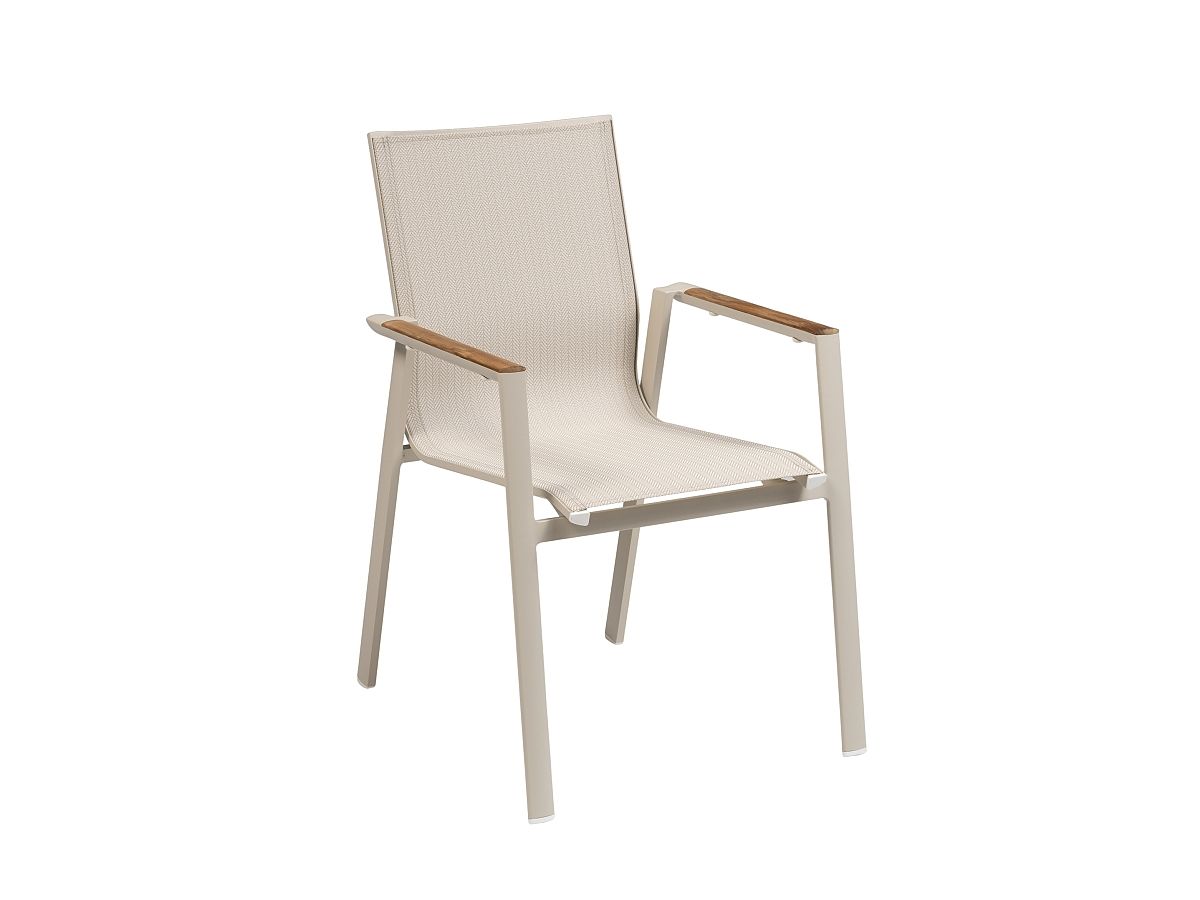 • Stolička Aspen: Hliníková konštrukcia (Ivory) s ergonomicky tvarovaným operadlom. Výplet z odolného textilu s moderným vzorom rybej kosti (v kombinácii svetlo- a tmavosivej). Podrúčky sú doplnené o elegantné lišty z umelého dreva v teakovom odtieni.