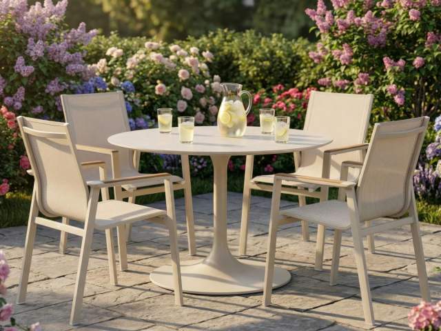 • Stôl Verona: Konštrukcia z práškovo lakovaného hliníka v odtieni Ivory. Doska zo špičkového materiálu Sinterstone Ivory, ktorá je vysoko odolná voči vonkajším vplyvom a nenáročná na údržbu.